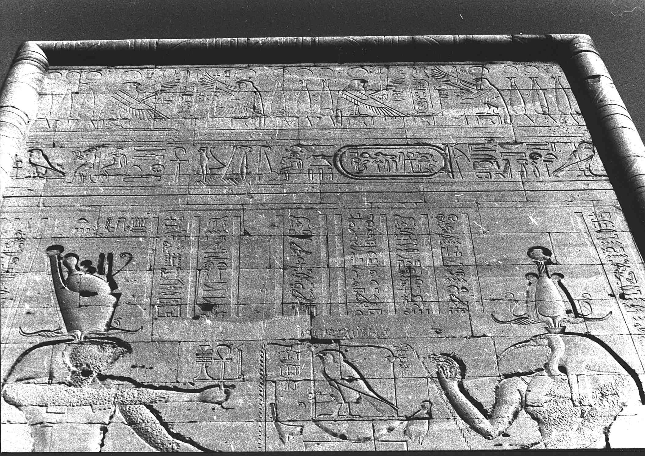 "Deine Majestät möge sich niederlassen auf deinem Thronsitz-seit-Anbeginn (Edfu) als Horus-der-Große, der Buntgefiederte, um deinen Ka dauerhaft zu machen im Fenster-deines-Erscheinens an <deinem>* Schönen-Fest-des-Festsetzens-deines-Erbes, und um dauern zu lassen das Amt des Tieres des Harachte, wenn es sein Königtum entgegennimmt."