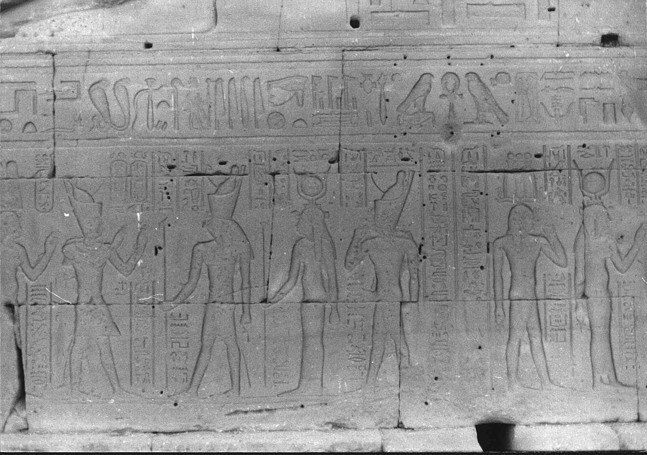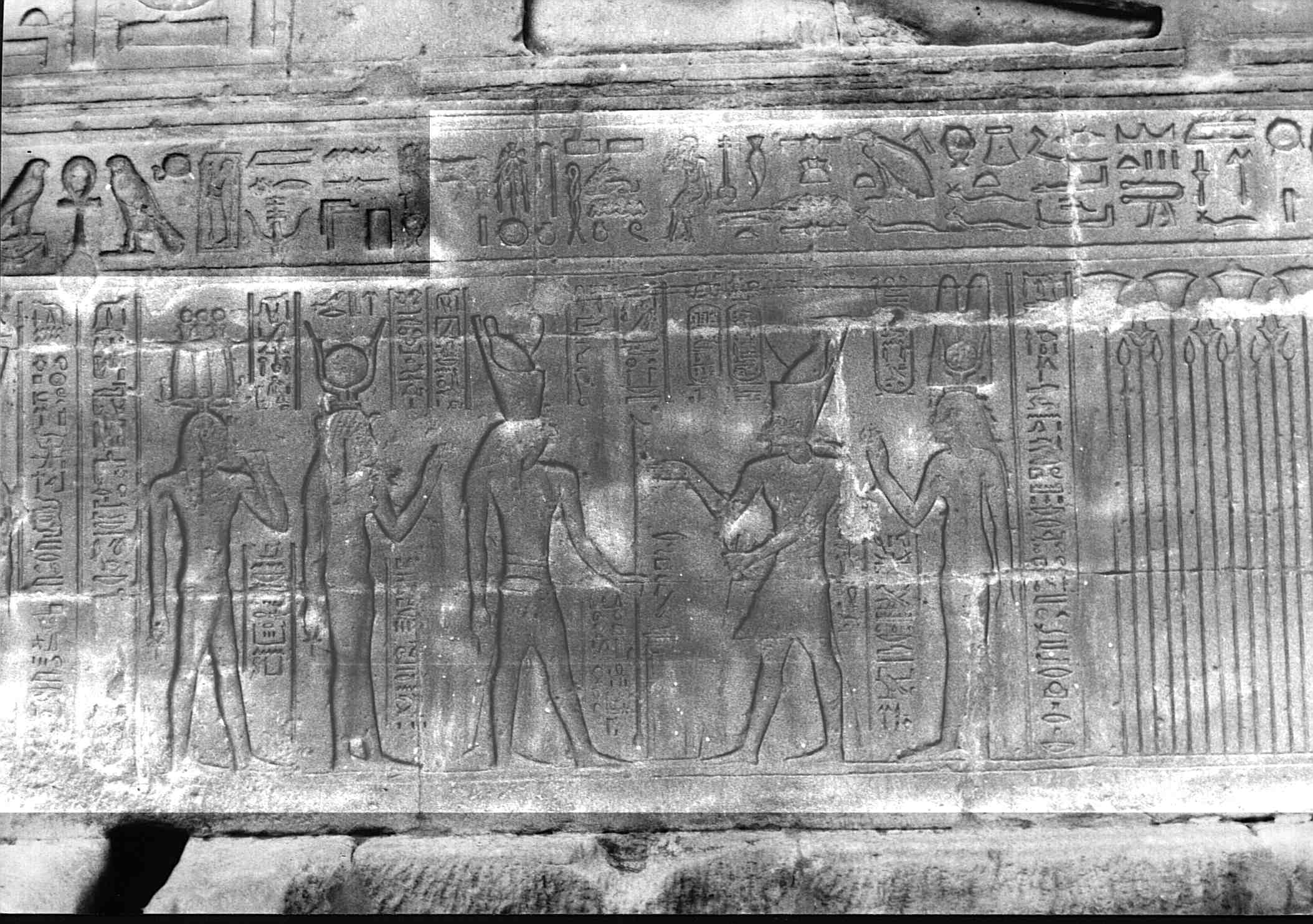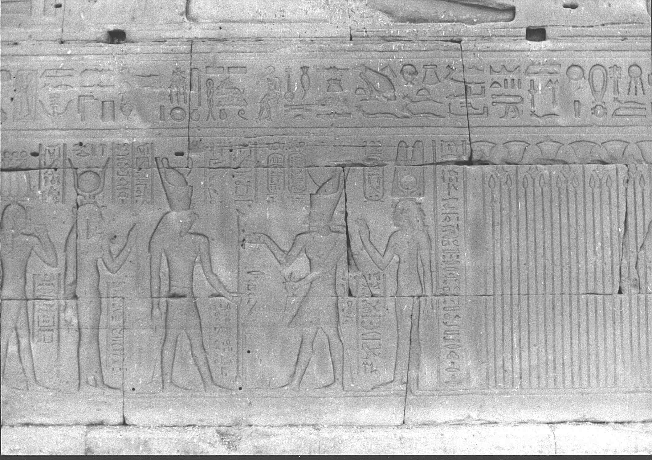 der König von Ober- und Unterägypten öPtol. X.Ä, zusammen mit seiner Schwester und Gattin, der Herrscherin, der Herrin der Beiden Länder öKleopatra Berenike III.Ä, die mutterliebenden Götter (Philometoren), geliebt von Horus Behedeti, dem großen Gott, dem Herrn des Himmels, Re Harachte im Großen-Sitz (Edfu).