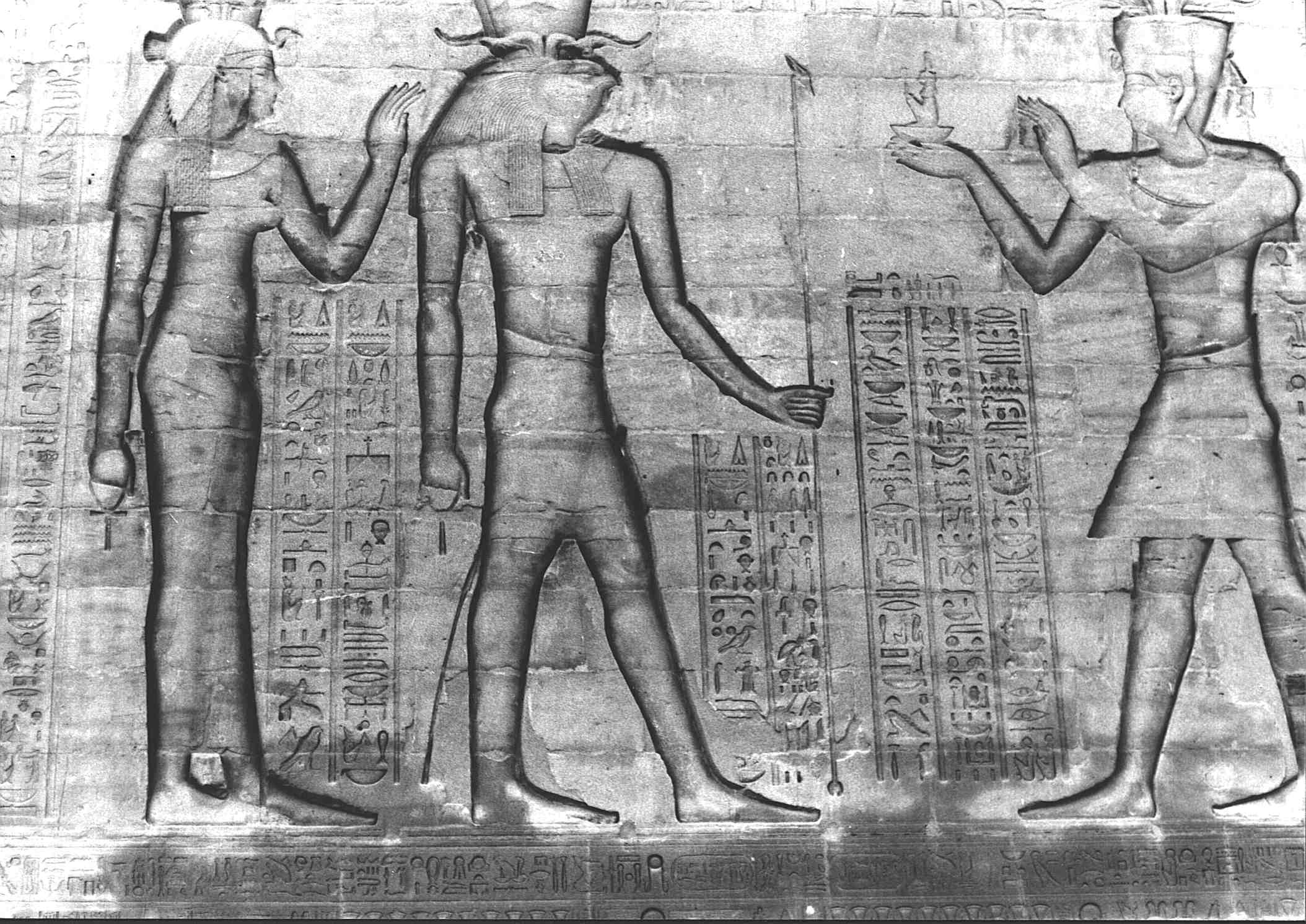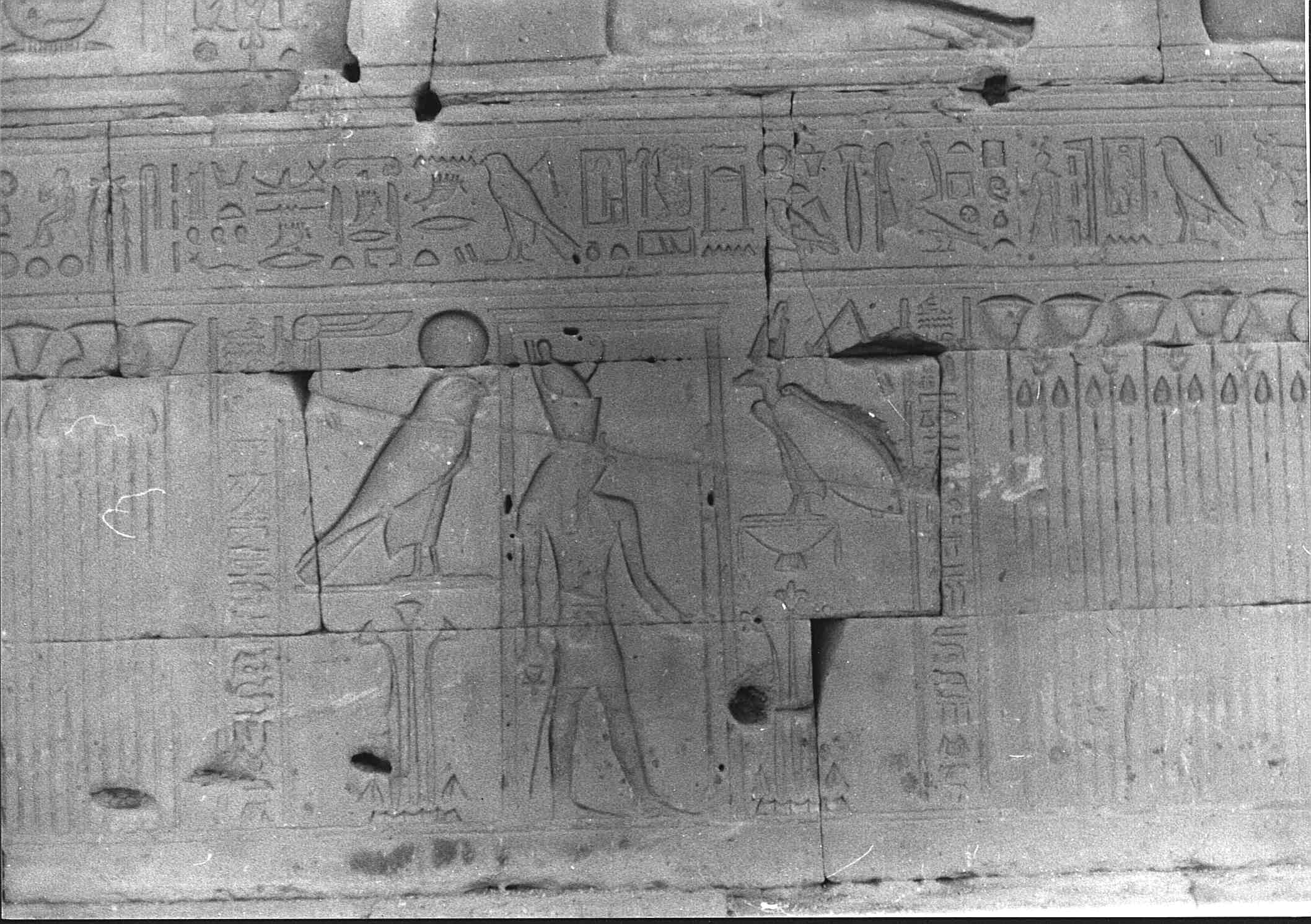 Diese vollkommene Stätte, der Gau-des-Horus-(Re), ist sein Horizont auf Erden, das Haus-des-Erscheinens Seiner Majestät, der Große-Thron seines Ka, in dem er auf- und untergeht, das Heiligtum,-das-Chepre-schützt des schnell geborenen Kindes (Horus), die Stätte, an der sein Leib genährt wird seit dem Uranfang,