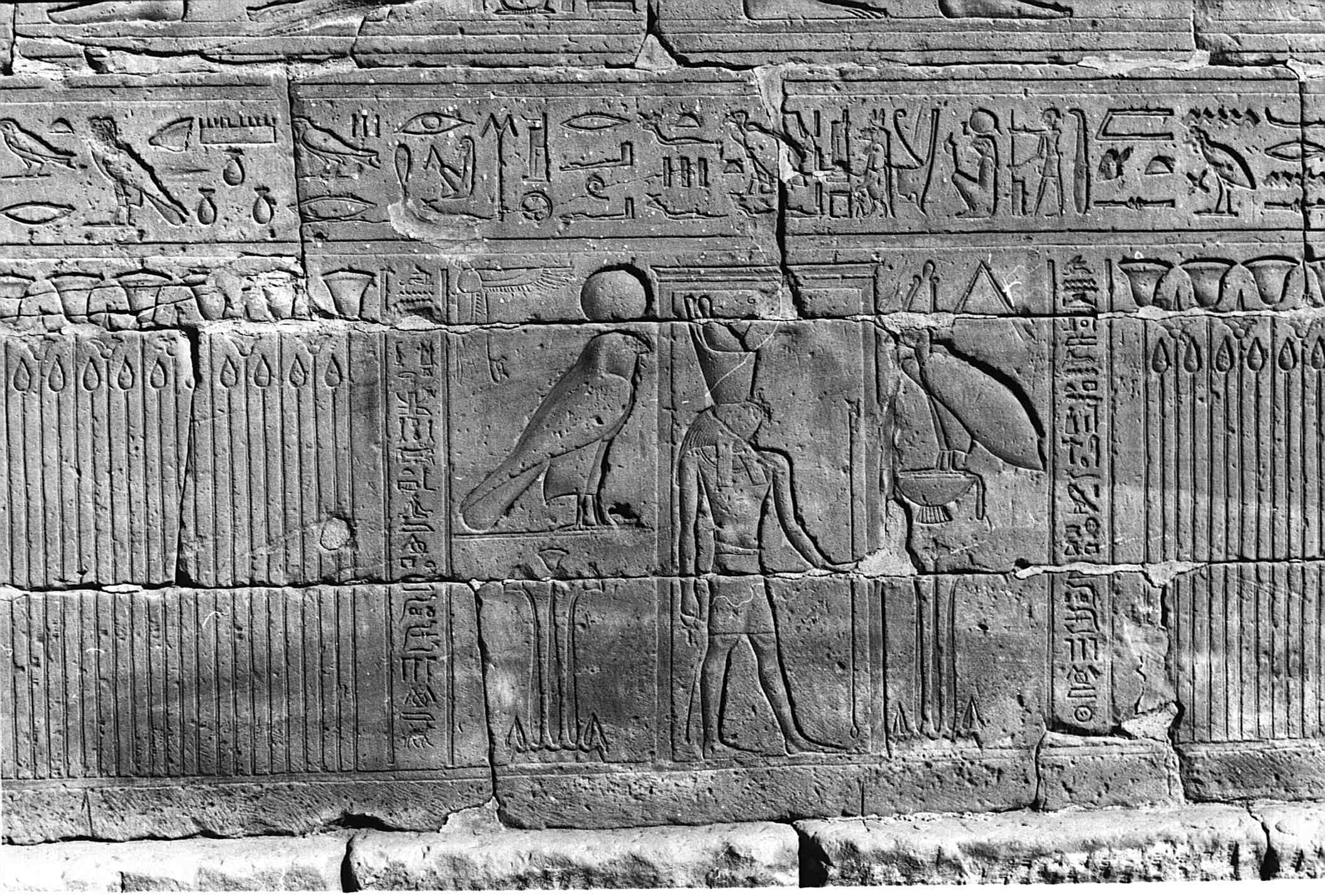 Der Große-Sitz-des-Re ist innerhalb von ihr errichtet, er gleicht dem Horizont des Himmels. Ein Pronaos ist ihm vor(gebaut), der (sich) vom Ost- zum Westgebirge (erstreckt). Er ist wie der Himmel mit den Bas der Götter. Breiter ist er als Mesen auf der rechten und linken Seite. Höher ist er als der vorderste Raum des Naos.