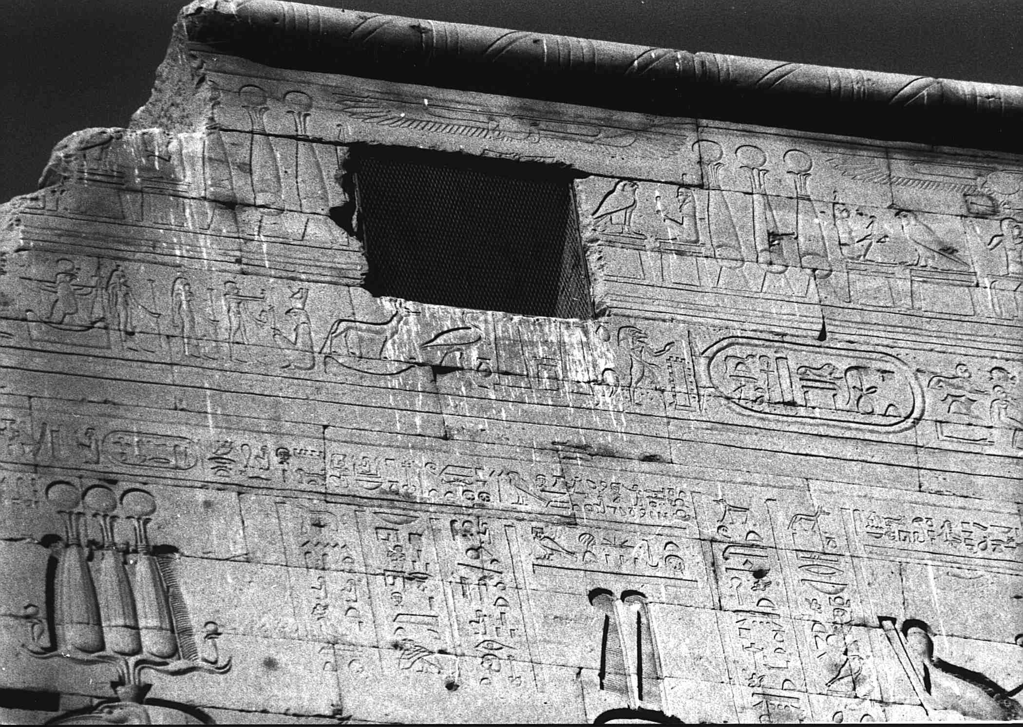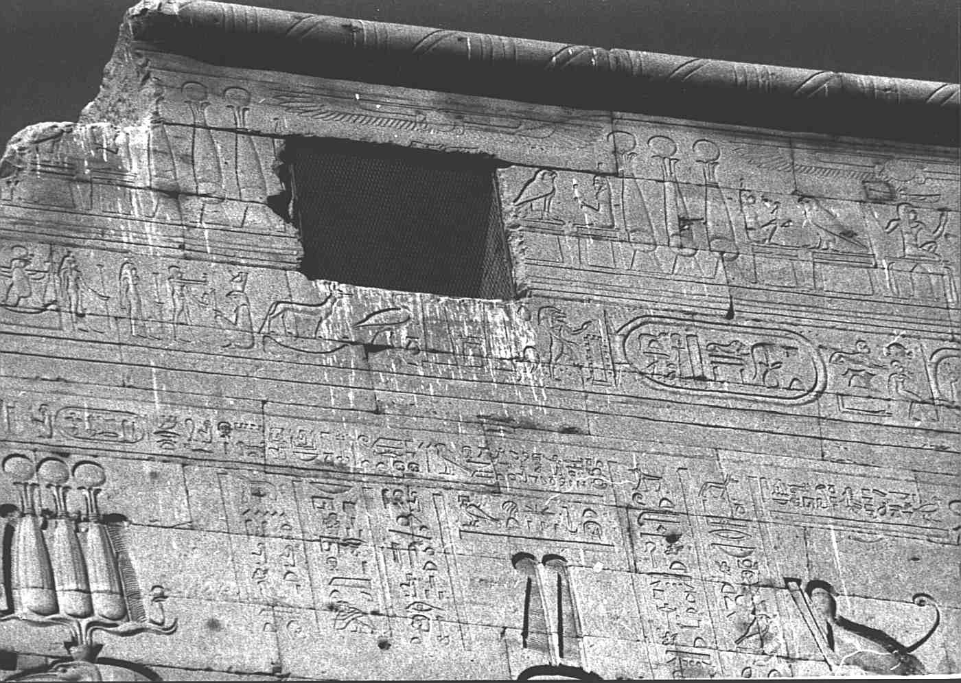 Der König von Ober- und Unterägypten, der Herr der beiden Länder öPtol. XII.Ä, der Sohn des Re, der Herr der Kronen öPtol. XII.Ä, der Sohn der Herrin von Fag (Nechbet), geboren von der von Buto (Uto), der die oberägyptische und die unterägyptische Krone ihrem Herrn darbringt.