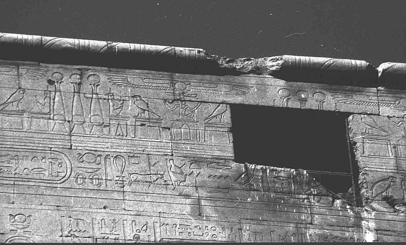 Worte zu sprechen von Horus Behedeti, dem großen Gott, dem Herrn des Himmels, dem Herrn der Doppelkrone, der sich auszeichnet mit dem Federnpaar, dem großen Herrscher im Erdkreis, der sein Gesicht erhellt mit seinem Schmuck, wenn er sich zeigt in seinem <%Haus&>* als Herrscher dieses Landes, vor dem die urzeitlichen Götter Respekt haben.