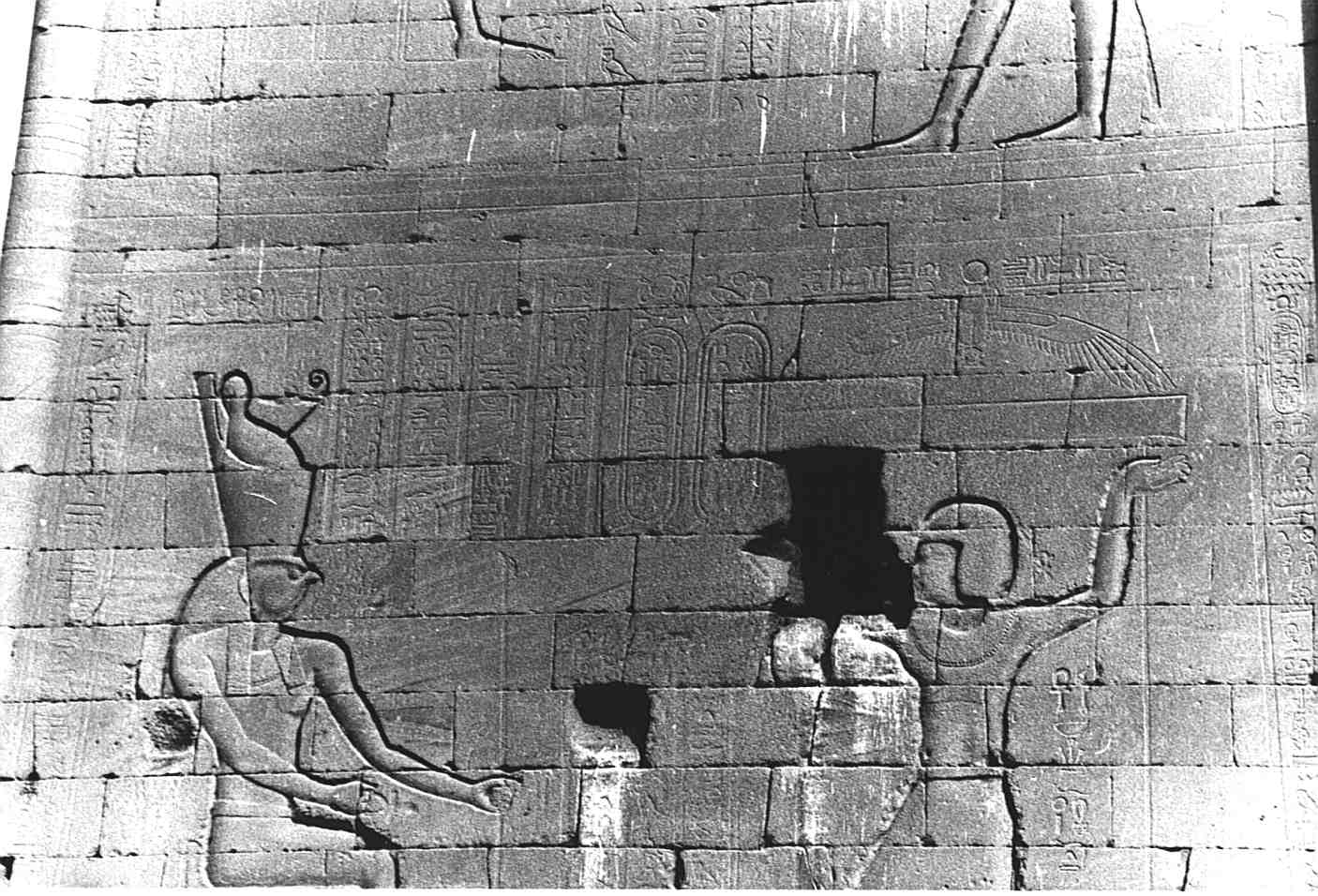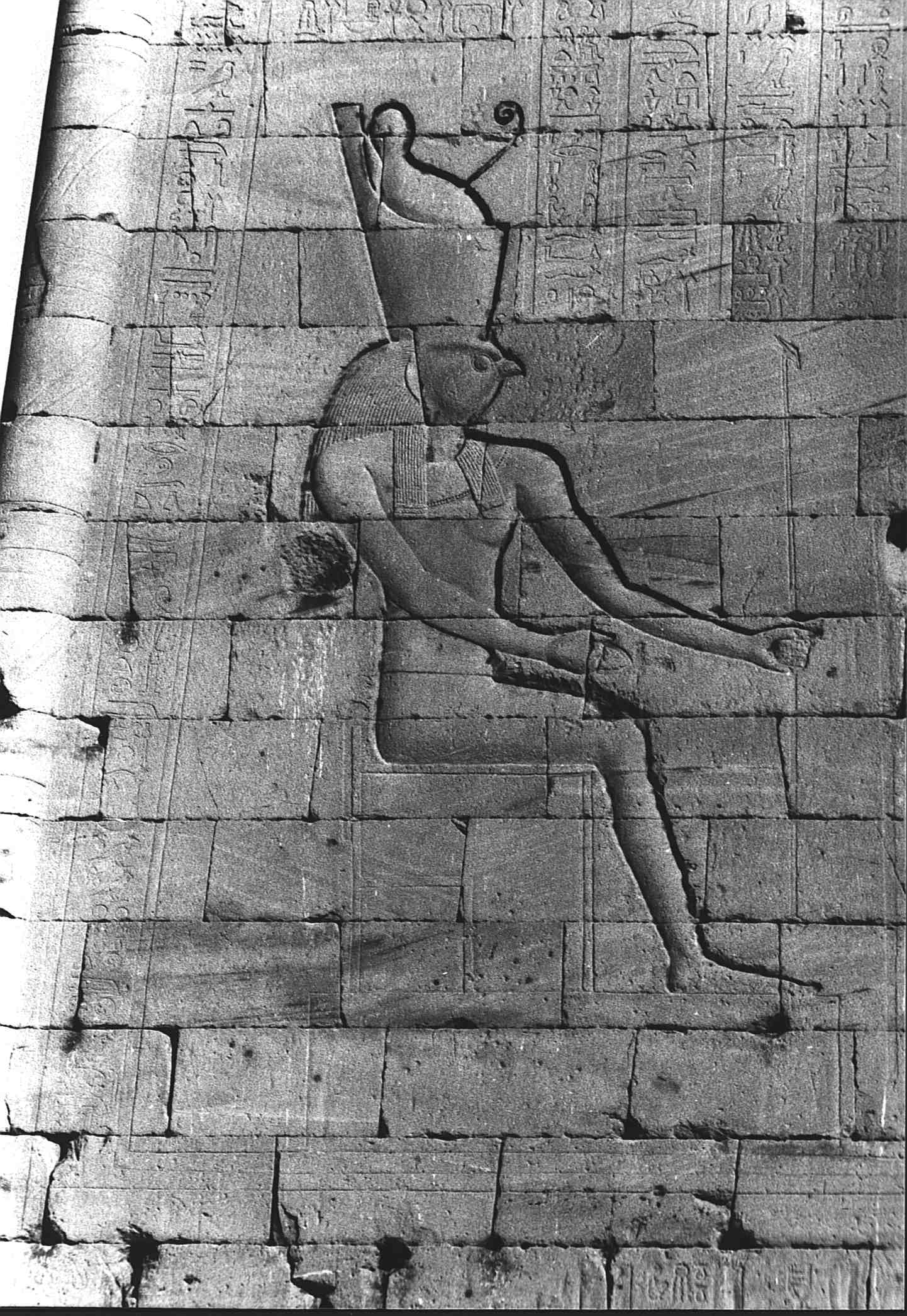 Harachte hat sich niedergelassen im Thronsitz (Edfu) als große Sonnenscheibe, die die beiden Länder erhellt, und er verbreitet Licht, vertreibt die Dunkelheit und erleuchtet den Thronsitz (Edfu) mit seinem Glanz. Er ist der <Herr>* des Sonnenlichts, der erschienen ist am Himmel, ehrfurchtgebietend im %Thronsitz-des-Horus (Gau von Edfu)&.