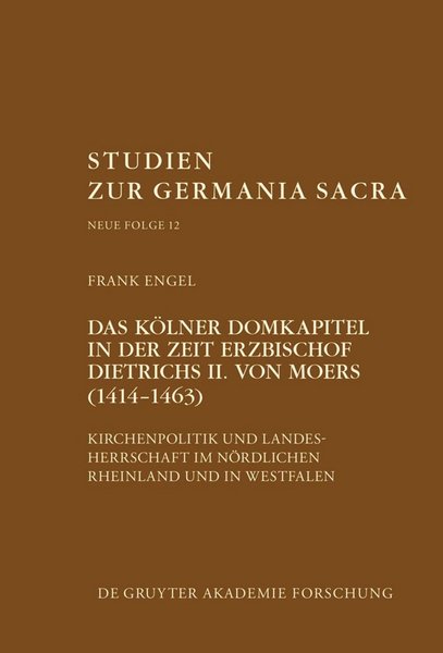 Engel, Frank, Das Kölner Domkapitel in der Zeit Erzbischof Dietrichs II. von Moers (1414–1463). Kirchenpolitik und Landesherrschaft im nördlichen Rheinland und in Westfalen (Studien zur Germania Sacra. Neue Folge 12), Berlin/Boston 2022.