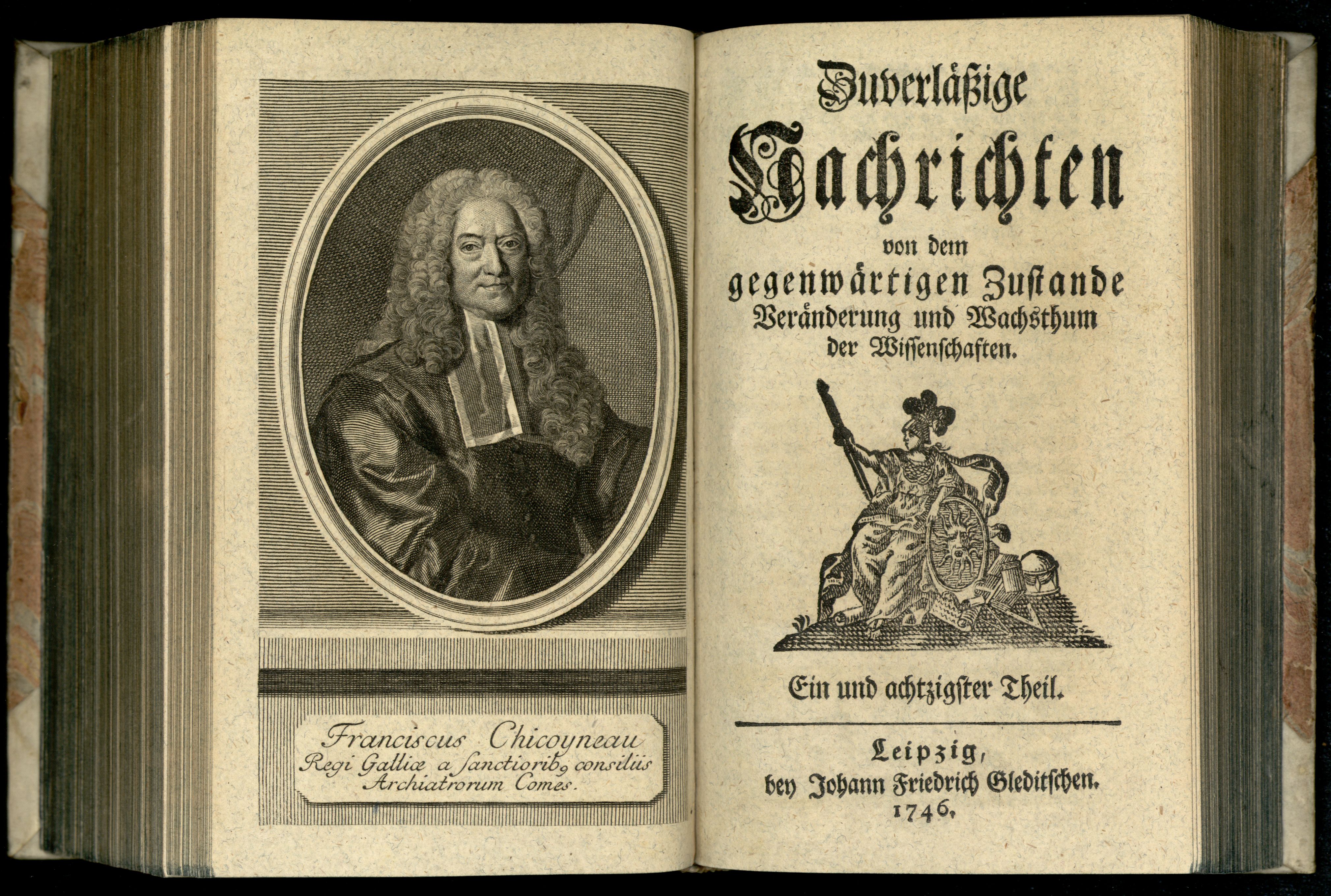 Porträt von Chicoyneau, François  (Zuverläßige Nachrichten von dem gegenwärtigen Zustande der Wissenschaften., 1746, 81. T., ungez. Bl. vor S. 622. [Doppelseite])
