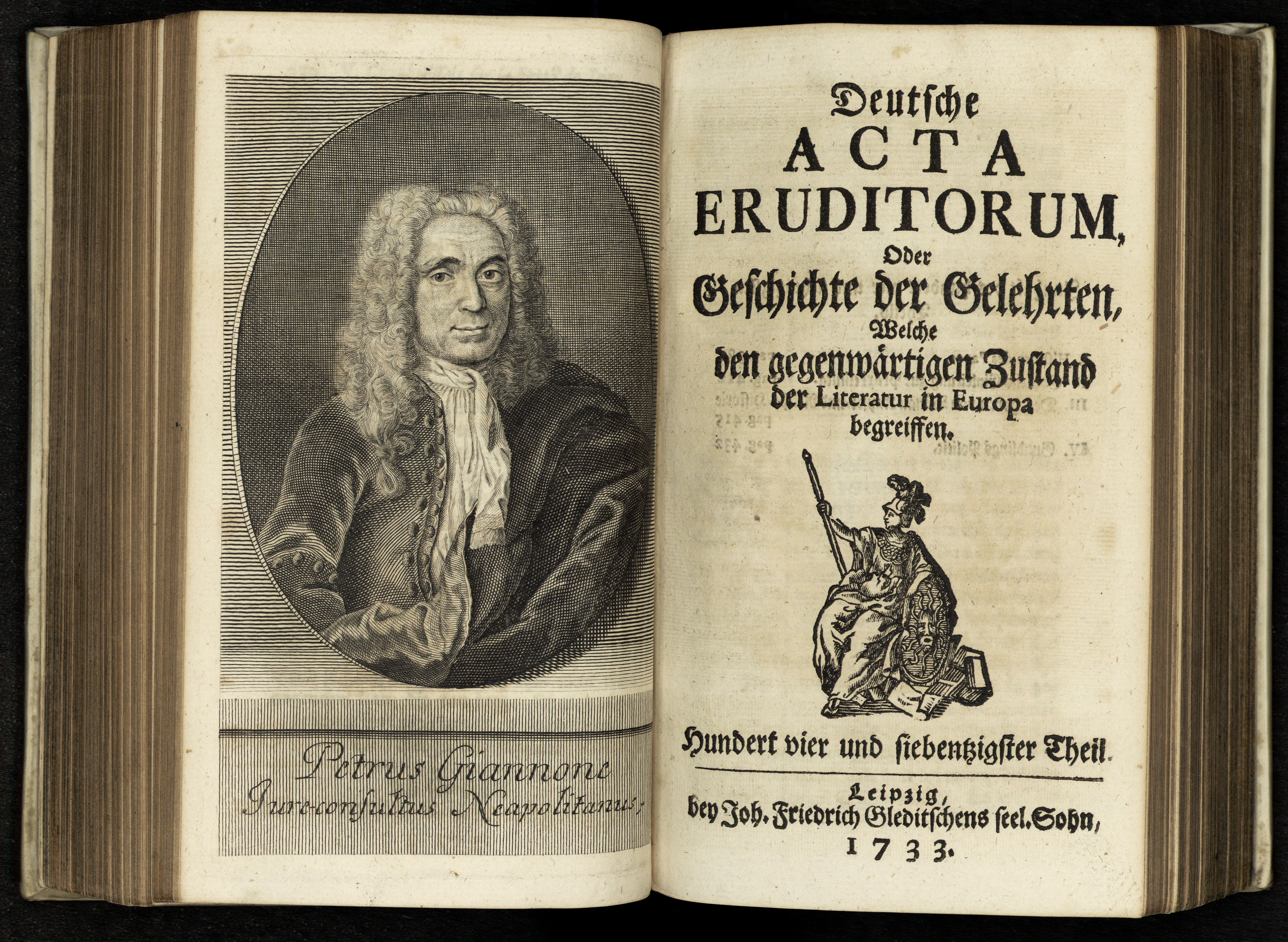 Porträt von Giannone, Pietro  (Deutsche Acta Eruditorum., 1733, 174. T., ungez. Bl. vor S. 381. [Doppelseite])