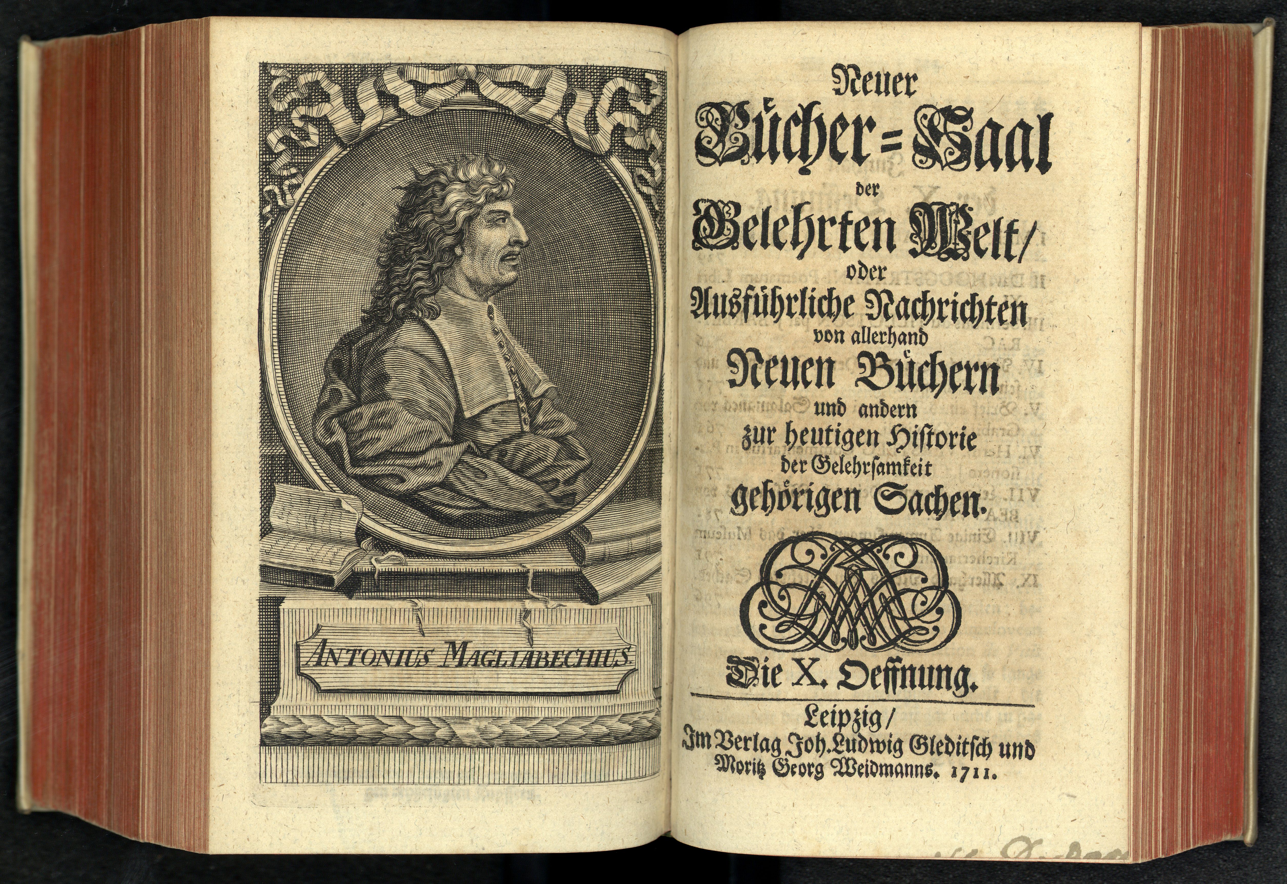 Porträt von Magliabechi, Antonio  (Neuer Bücher-Saal der gelehrten Welt., 1711, 10. Oeffn., ungez. Bl. vor S. 729. [Doppelseite])