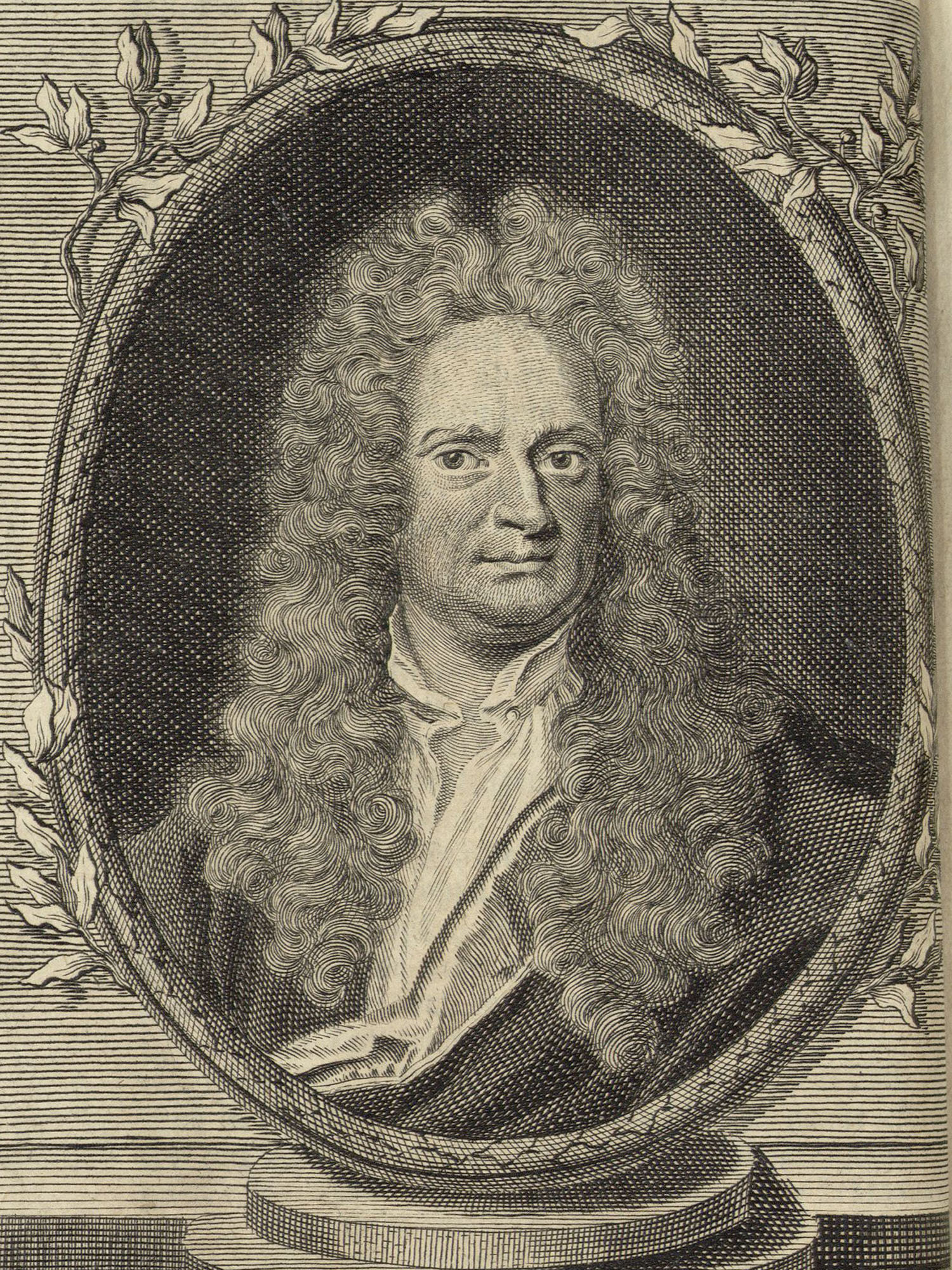 Porträt von Newton, Isaac  (Deutsche Acta Eruditorum., 1715, 38. T., ungez. Bl. vor S. 77. [Zuschnitt auf Schmuckrahmen])