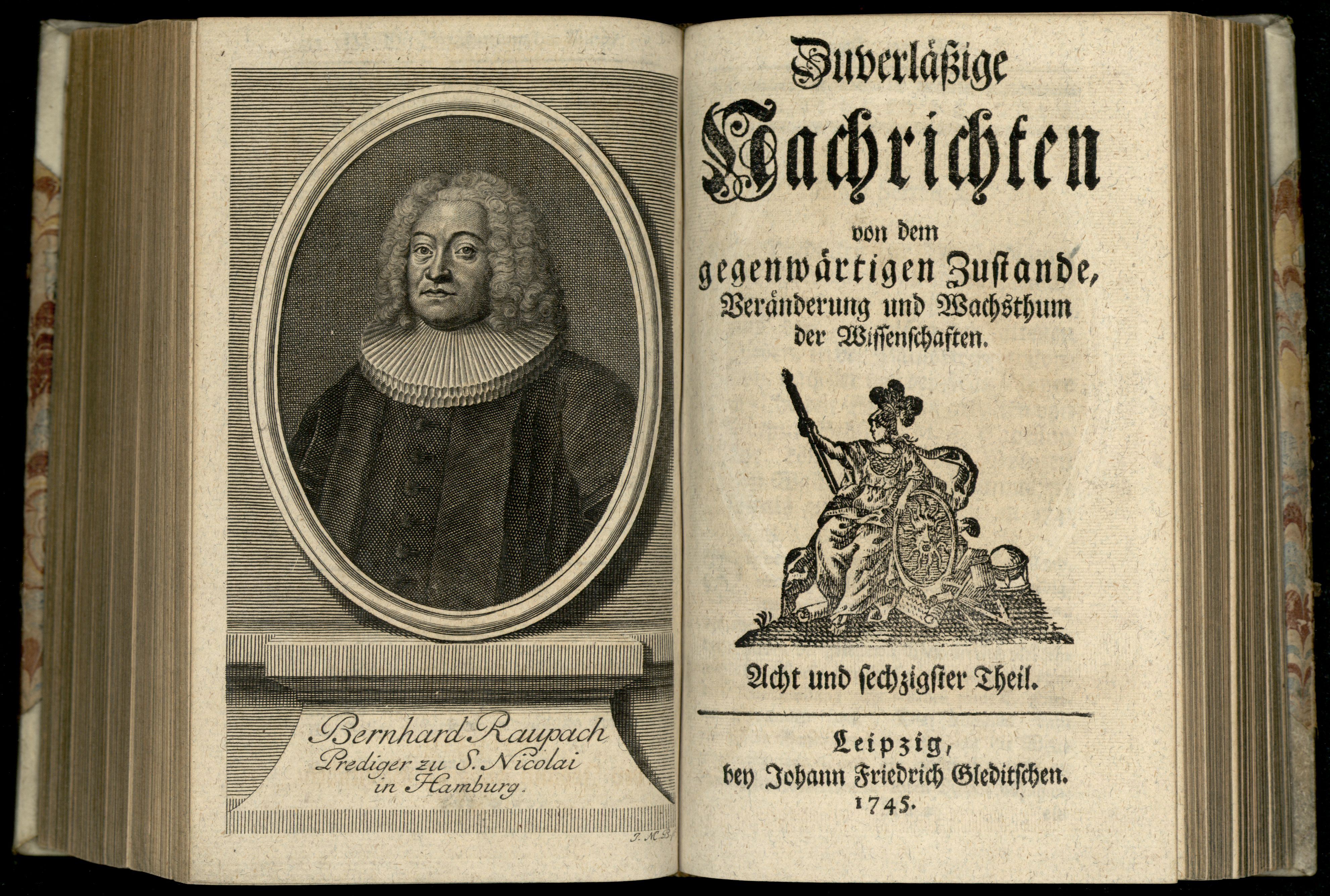 Porträt von Raupach, Bernhard  (Zuverläßige Nachrichten von dem gegenwärtigen Zustande der Wissenschaften., 1745, 68. T., ungez. Bl. vor S. 533. [Doppelseite])