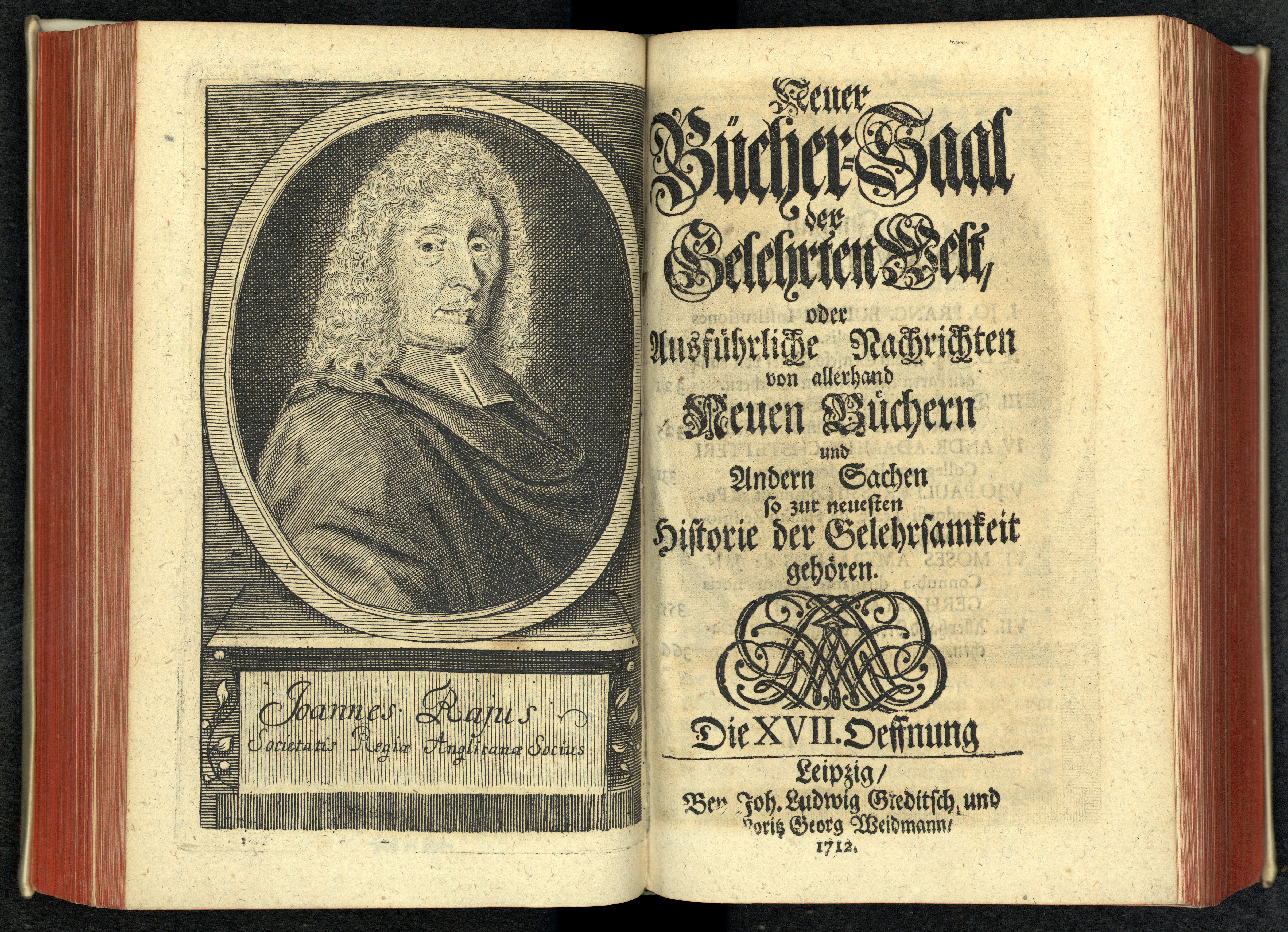 Porträt von Ray, John  (Neuer Bücher-Saal der gelehrten Welt., 1712, 17. Oeffn., ungez. Bl. vor S. 301. [Doppelseite])