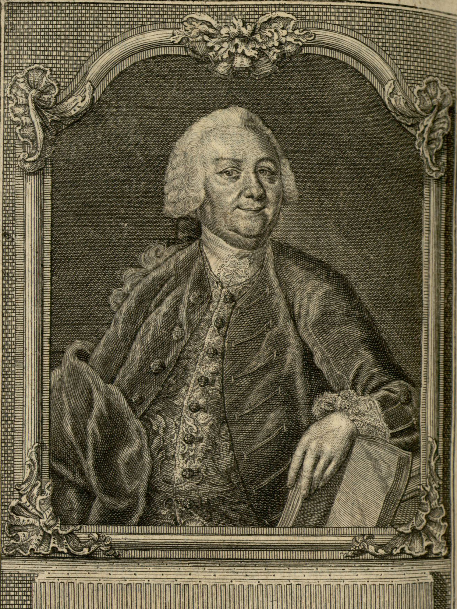 Porträt von Topp, Johann Konrad Sigismund  (Zuverläßige Nachrichten von dem gegenwärtigen Zustande der Wissenschaften., 1756, 200. T., ungez. Bl. vor S. 550. [Zuschnitt auf Schmuckrahmen])