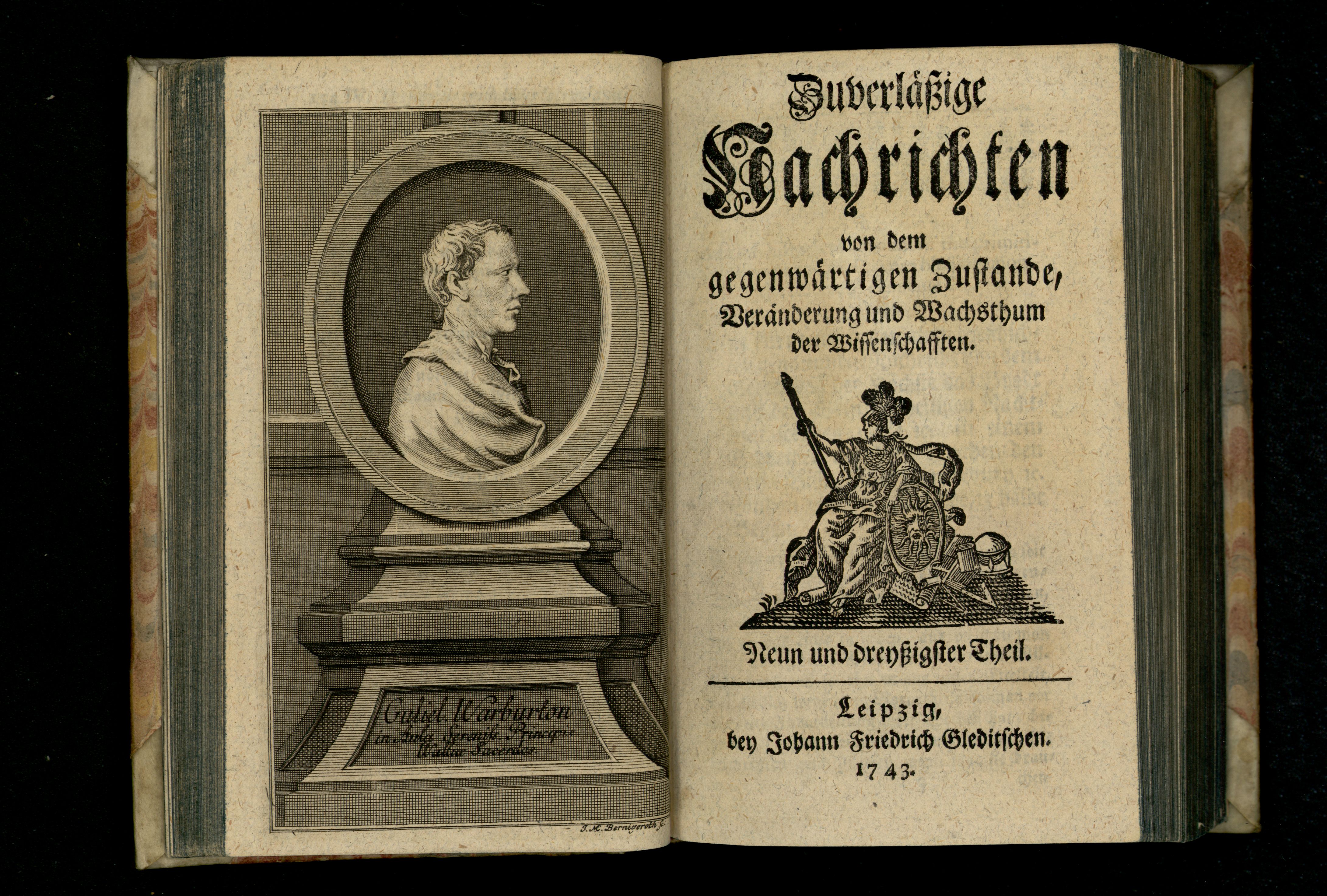 Porträt von Warburton, William  (Zuverläßige Nachrichten von dem gegenwärtigen Zustande der Wissenschaften., 1743, 39. T., ungez. Bl. vor S. 155. [Doppelseite])