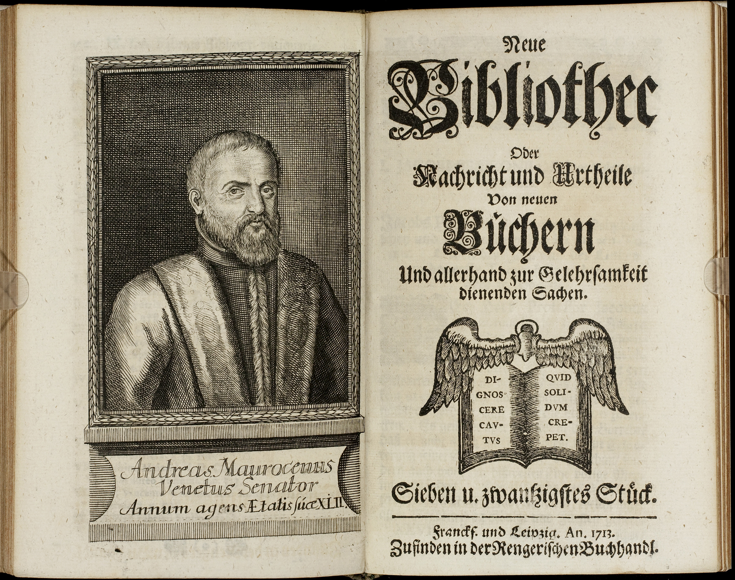 Porträt von Morosini, Andrea  (Neue Bibliothec oder Nachricht und Urtheile von neuen Büchern., 1713, 27. St., ungez. Bl. vor S. 555. [Doppelseite])