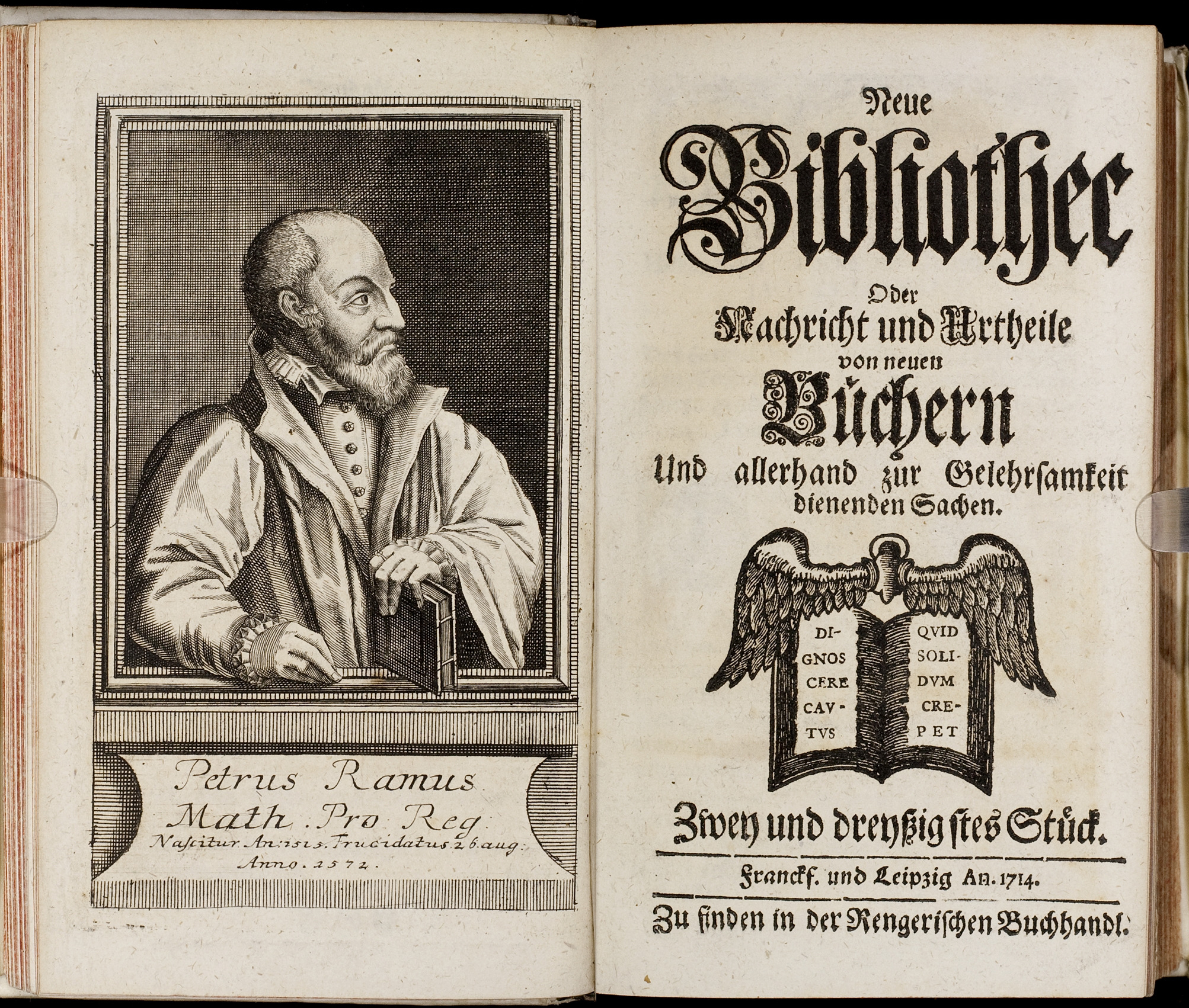 Porträt von Ramus, Petrus  (Neue Bibliothec oder Nachricht und Urtheile von neuen Büchern., 1714, 32. St., ungez. Bl. vor S. 81. [Doppelseite])
