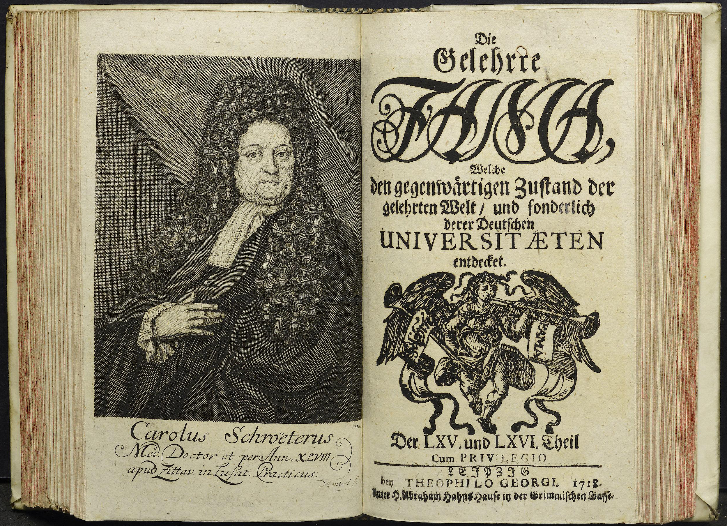 Porträt von Schröter, Karl  (Die Gelehrte Fama, welche den gegenwärtigen Zustand der gelehrten Welt und sonderlich derer deutschen Universitäten entdecket., 1718, 65/66. T., ungez. Bl. am Anf. d. Stückes. [Doppelseite])