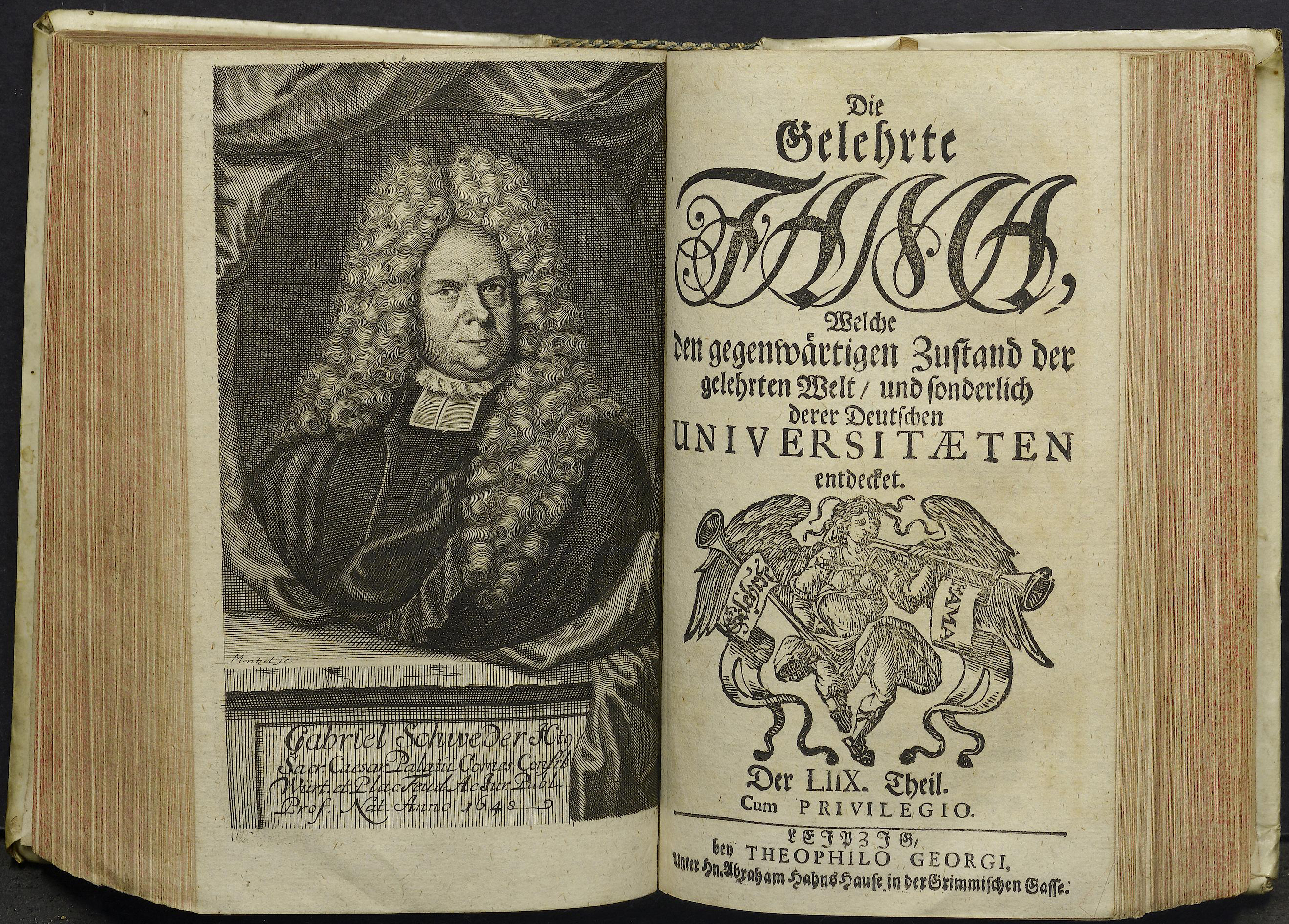 Porträt von Schweder, Gabriel  (Die Gelehrte Fama, welche den gegenwärtigen Zustand der gelehrten Welt und sonderlich derer deutschen Universitäten entdecket., 1717, 58. T., ungez. Bl. am Anf. d. Stückes. [Doppelseite])