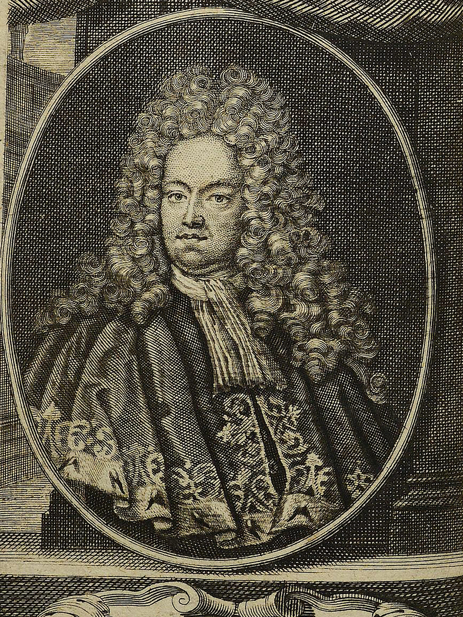 Porträt von Mencke, Johann Burkhard  (Die Gelehrte Fama, welche den gegenwärtigen Zustand der gelehrten Welt und sonderlich derer deutschen Universitäten entdecket., 1715, 43. T., ungez. Bl. am Anf. d. Stückes. [Zuschnitt auf Schmuckrahmen])