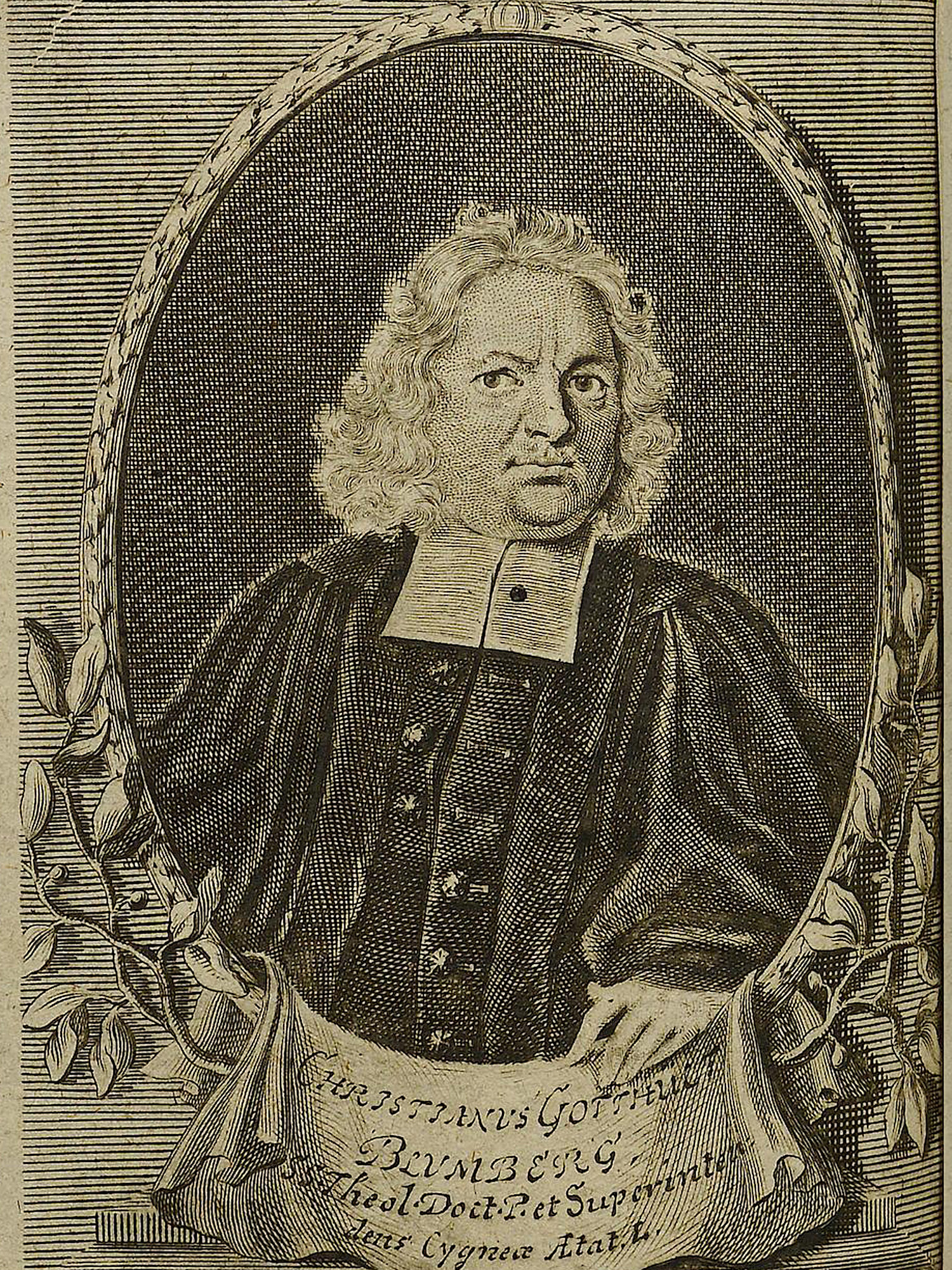 Porträt von Blumberg, Christian Gotthelf  (Die Gelehrte Fama, welche den gegenwärtigen Zustand der gelehrten Welt und sonderlich derer deutschen Universitäten entdecket., 1714, 35/36. T., ungez. Bl. am Anf. d. Stückes. [Zuschnitt auf Schmuckrahmen])