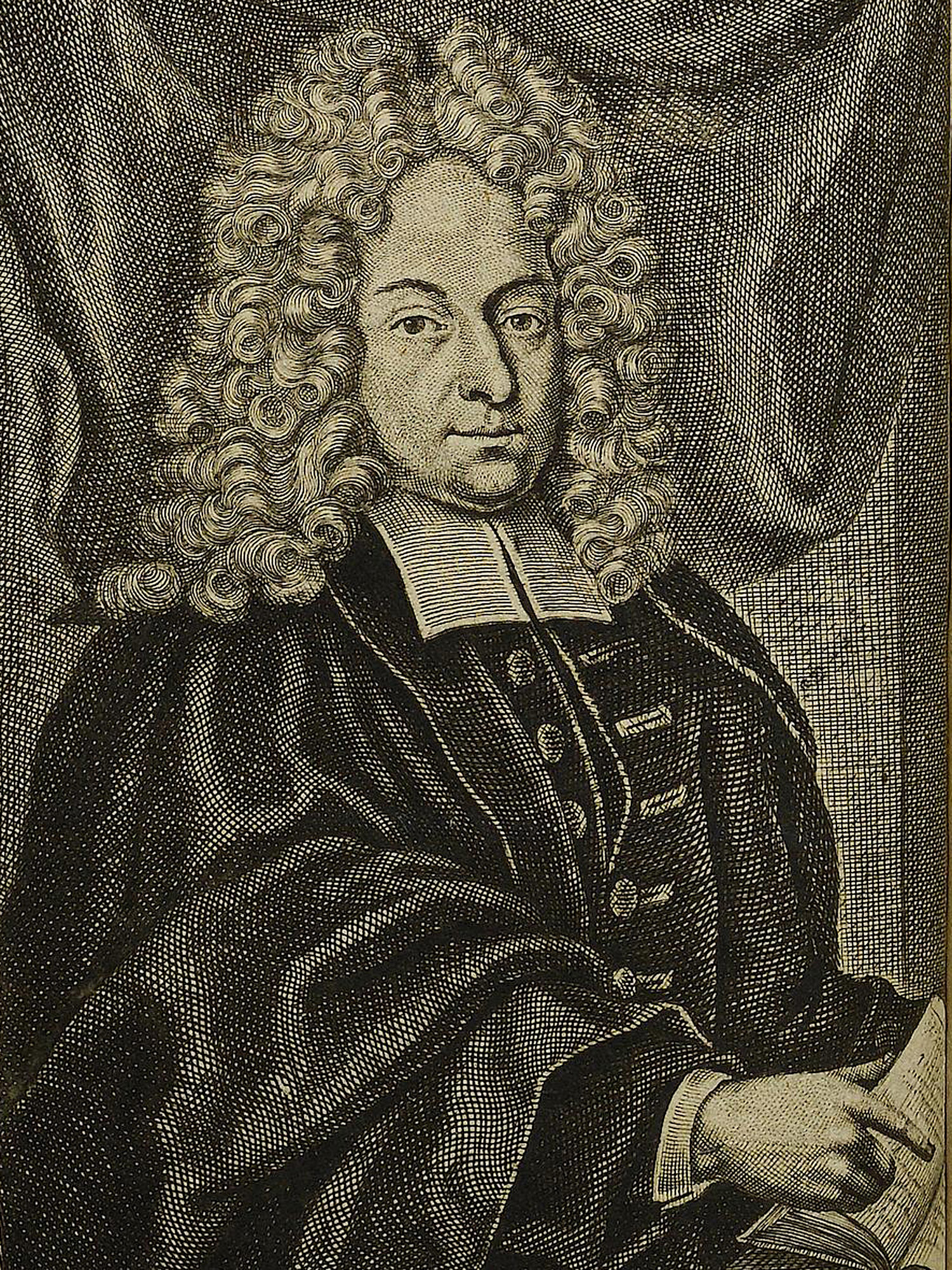 Porträt von Grünenberg, Johann Peter  (Die Gelehrte Fama, welche den gegenwärtigen Zustand der gelehrten Welt und sonderlich derer deutschen Universitäten entdecket., 1714, 31. T., ungez. Bl. am Anf. d. Stückes. [Zuschnitt auf Schmuckrahmen])