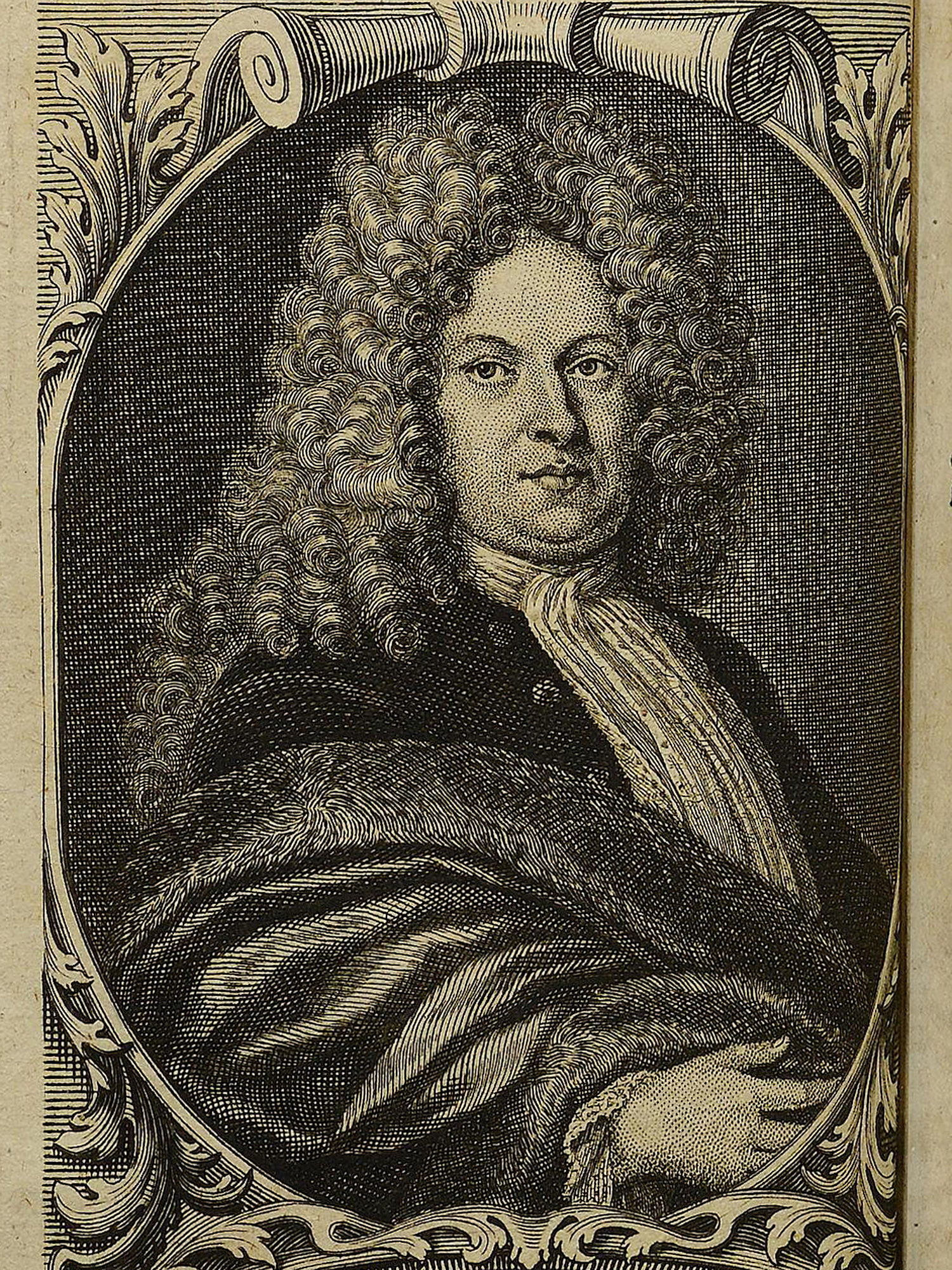 Porträt von Platz, Abraham Christoph  (Die Gelehrte Fama, welche den gegenwärtigen Zustand der gelehrten Welt und sonderlich derer deutschen Universitäten entdecket., 1712, 19. T., ungez. Bl. am Anf. d. Stückes. [Zuschnitt auf Schmuckrahmen])