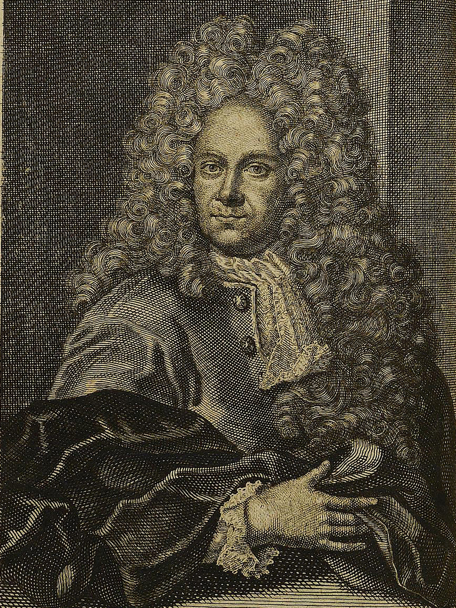 Porträt von Berger, Johann Heinrich von  (Die Gelehrte Fama, welche den gegenwärtigen Zustand der gelehrten Welt und sonderlich derer deutschen Universitäten entdecket., 1712, 16. T., ungez. Bl. am Anf. d. Stückes. [Zuschnitt auf Schmuckrahmen])