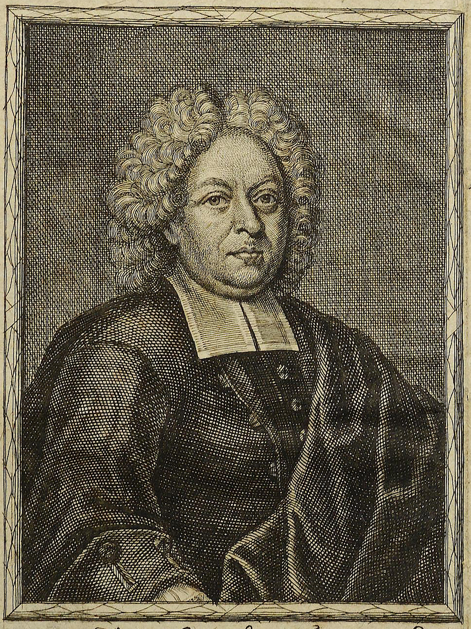 Porträt von Foertsch, Michael  (Die Gelehrte Fama, welche den gegenwärtigen Zustand der gelehrten Welt und sonderlich derer deutschen Universitäten entdecket., 1712, 13. T., ungez. Bl. am Anf. d. Stückes. [Zuschnitt auf Schmuckrahmen])
