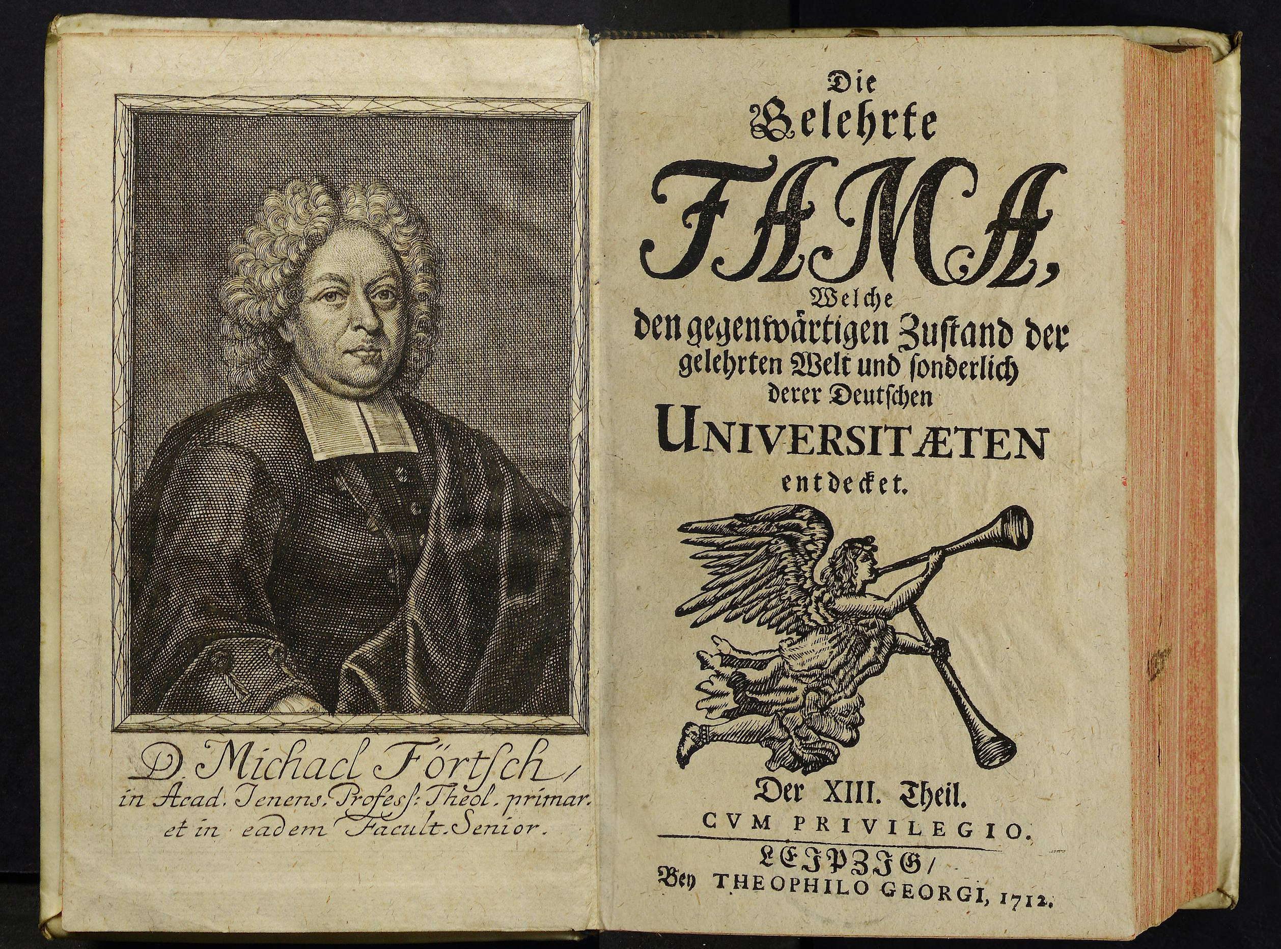 Porträt von Foertsch, Michael  (Die Gelehrte Fama, welche den gegenwärtigen Zustand der gelehrten Welt und sonderlich derer deutschen Universitäten entdecket., 1712, 13. T., ungez. Bl. am Anf. d. Stückes. [Doppelseite])