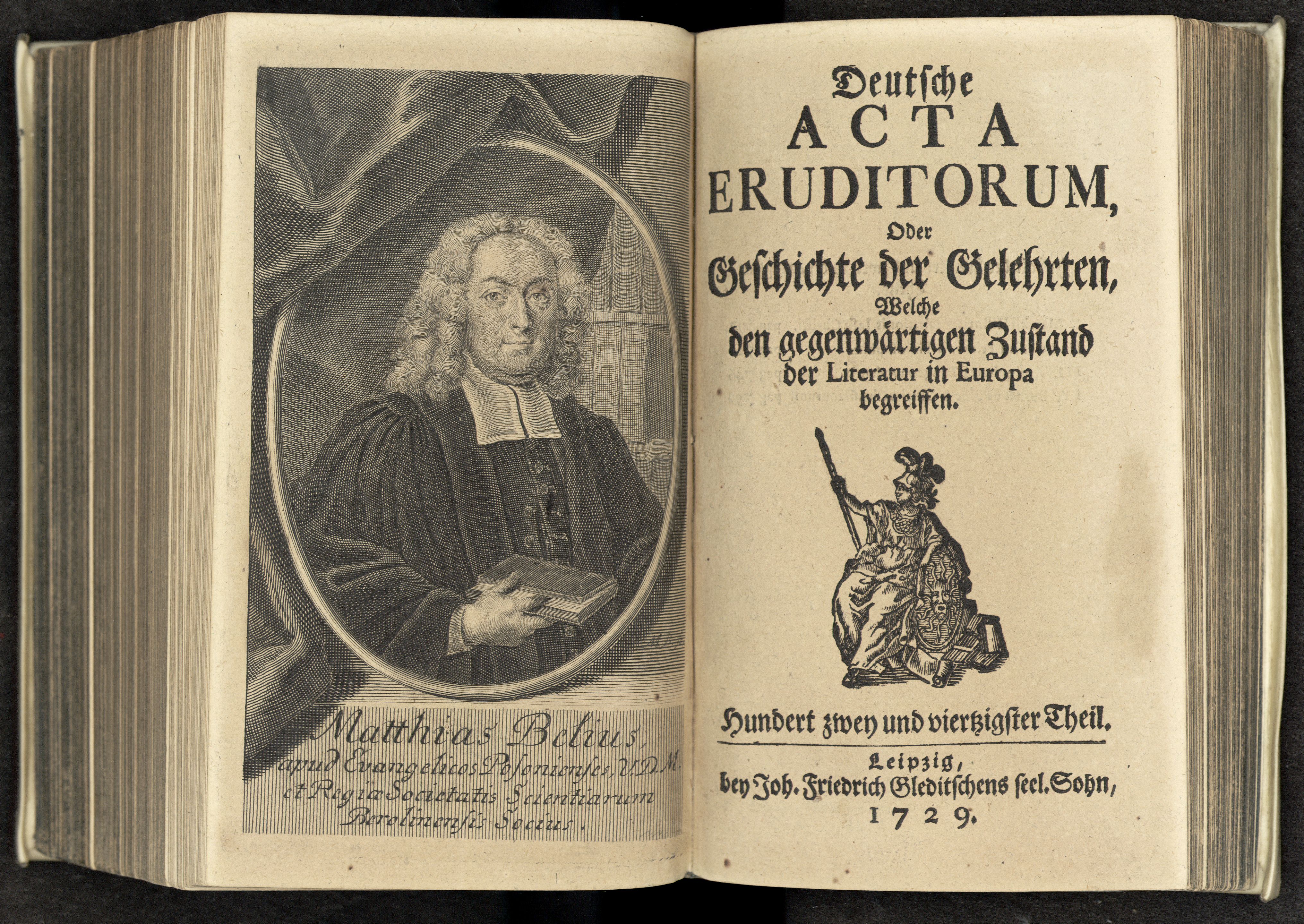 Porträt von Bél, Mátyás  (Deutsche Acta Eruditorum., 1729, 142. T., ungez. Bl. vor S. 693. [Doppelseite])