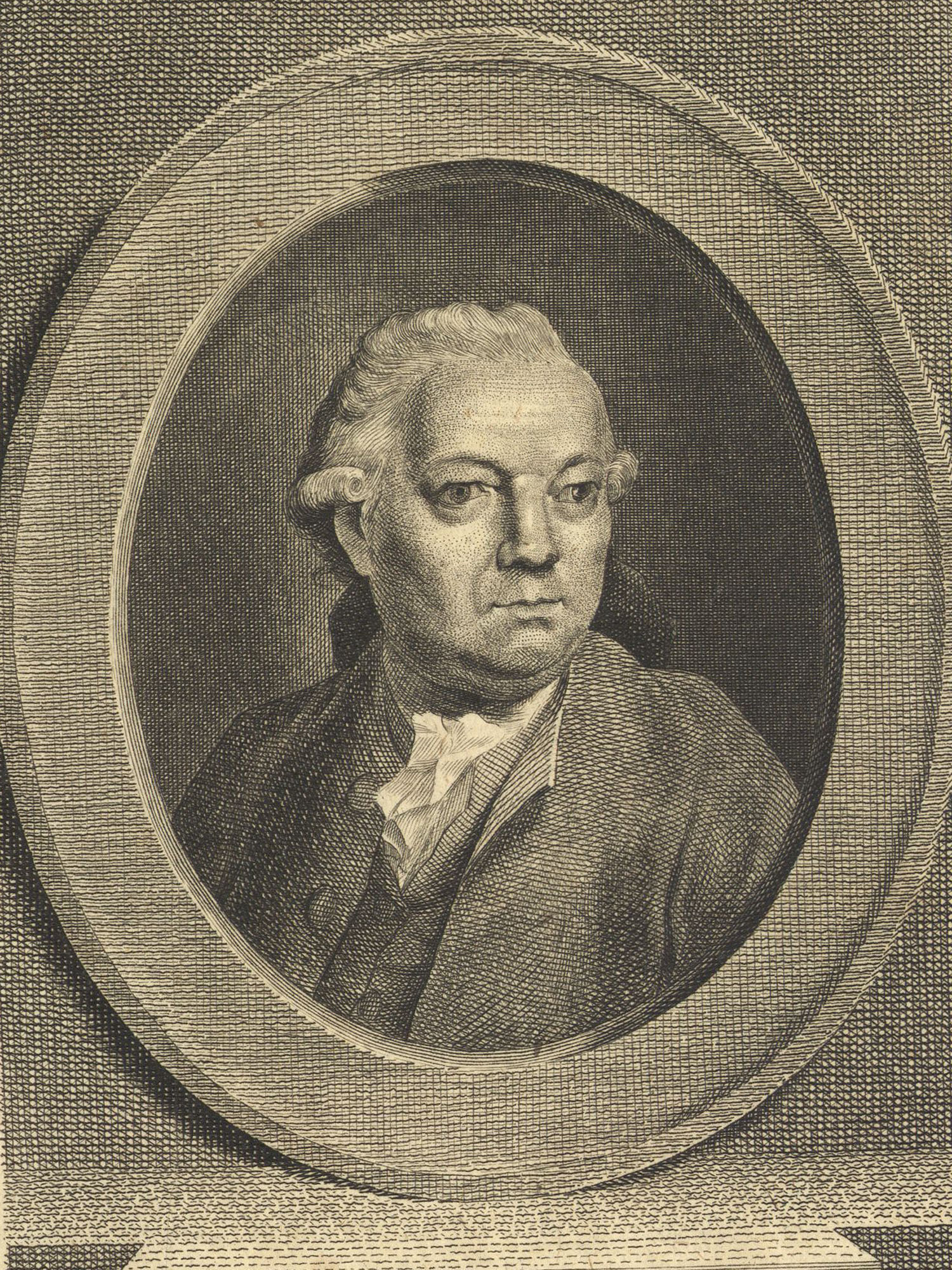 Porträt von Benda, Georg  (Neue Bibliothek der schönen Wissenschaften., 1778, 21. Bd., 1. St., ungez. Bl. am Anf. d. Bandes. [Zuschnitt auf Schmuckrahmen])