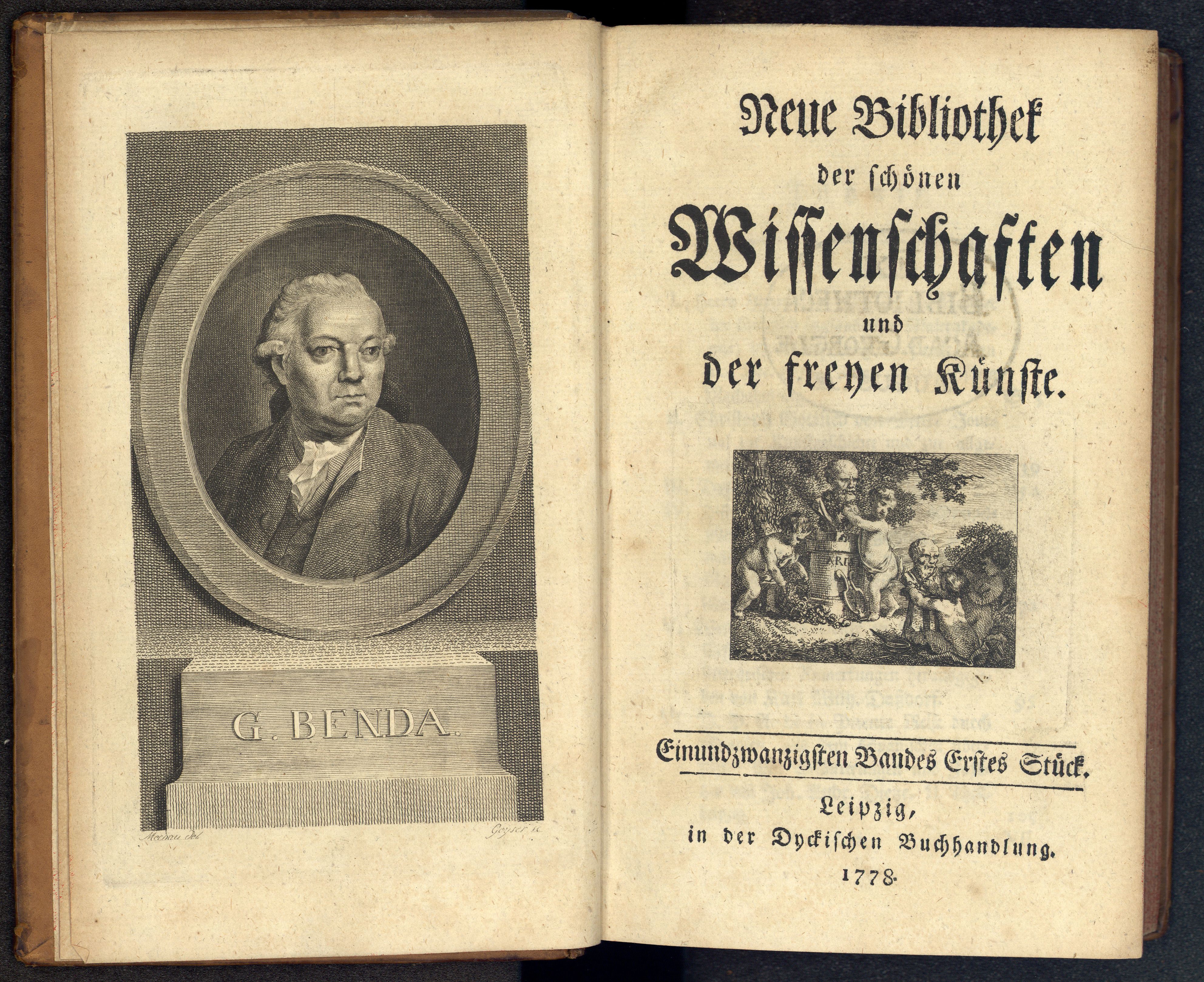 Porträt von Benda, Georg  (Neue Bibliothek der schönen Wissenschaften., 1778, 21. Bd., 1. St., ungez. Bl. am Anf. d. Bandes. [Doppelseite])