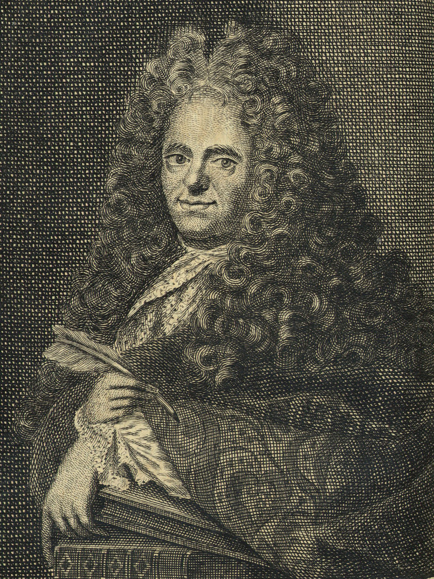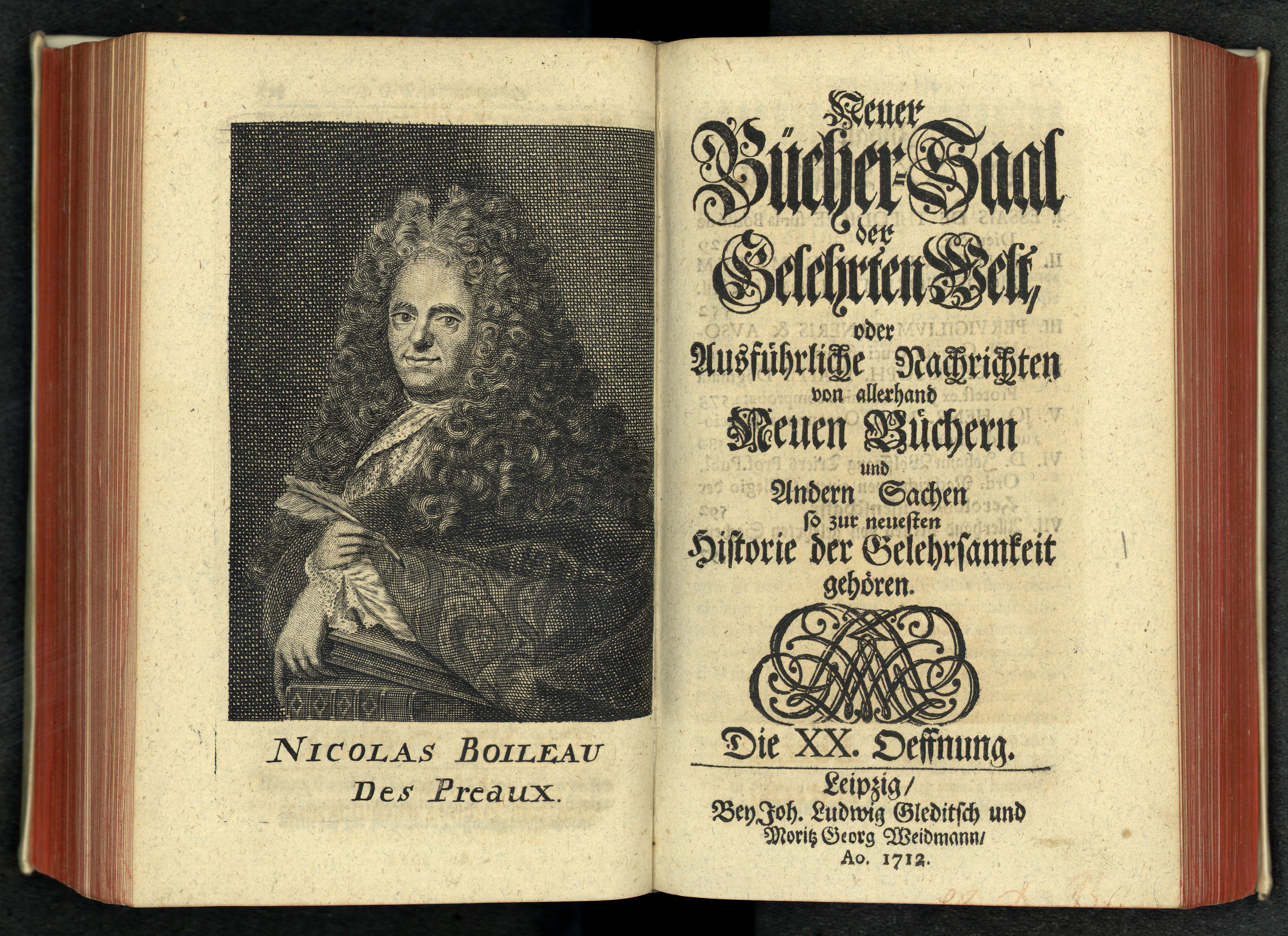 Porträt von Boileau Despréaux, Nicolas  (Neuer Bücher-Saal der gelehrten Welt., 1712, 20. Oeffn., ungez. Bl. vor S. 529. [Doppelseite])