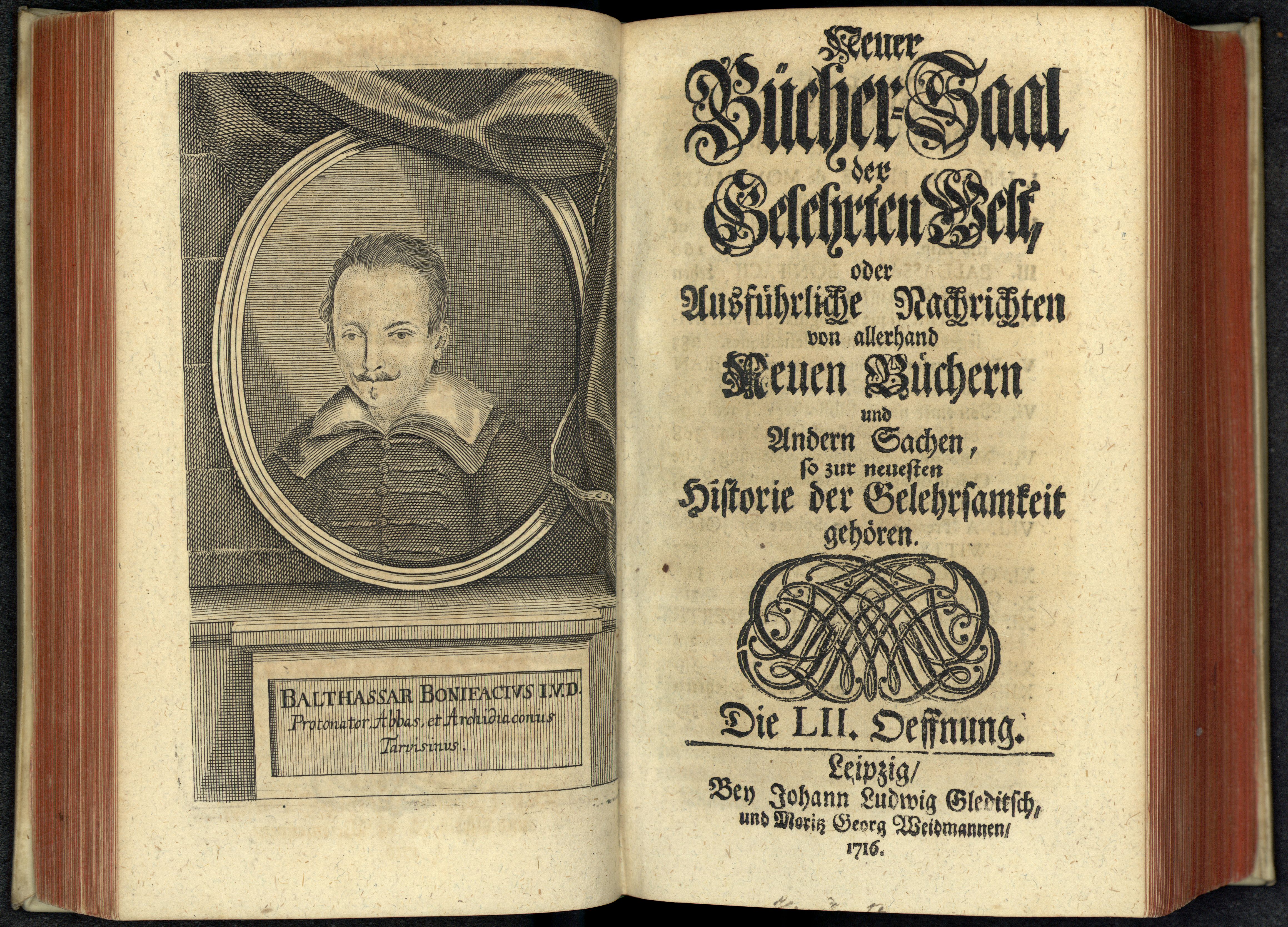 Porträt von Bonifacio, Baldassare  (Neuer Bücher-Saal der gelehrten Welt., 1716, 52. Oeffn., ungez. Bl. vor S. 249. [Doppelseite])
