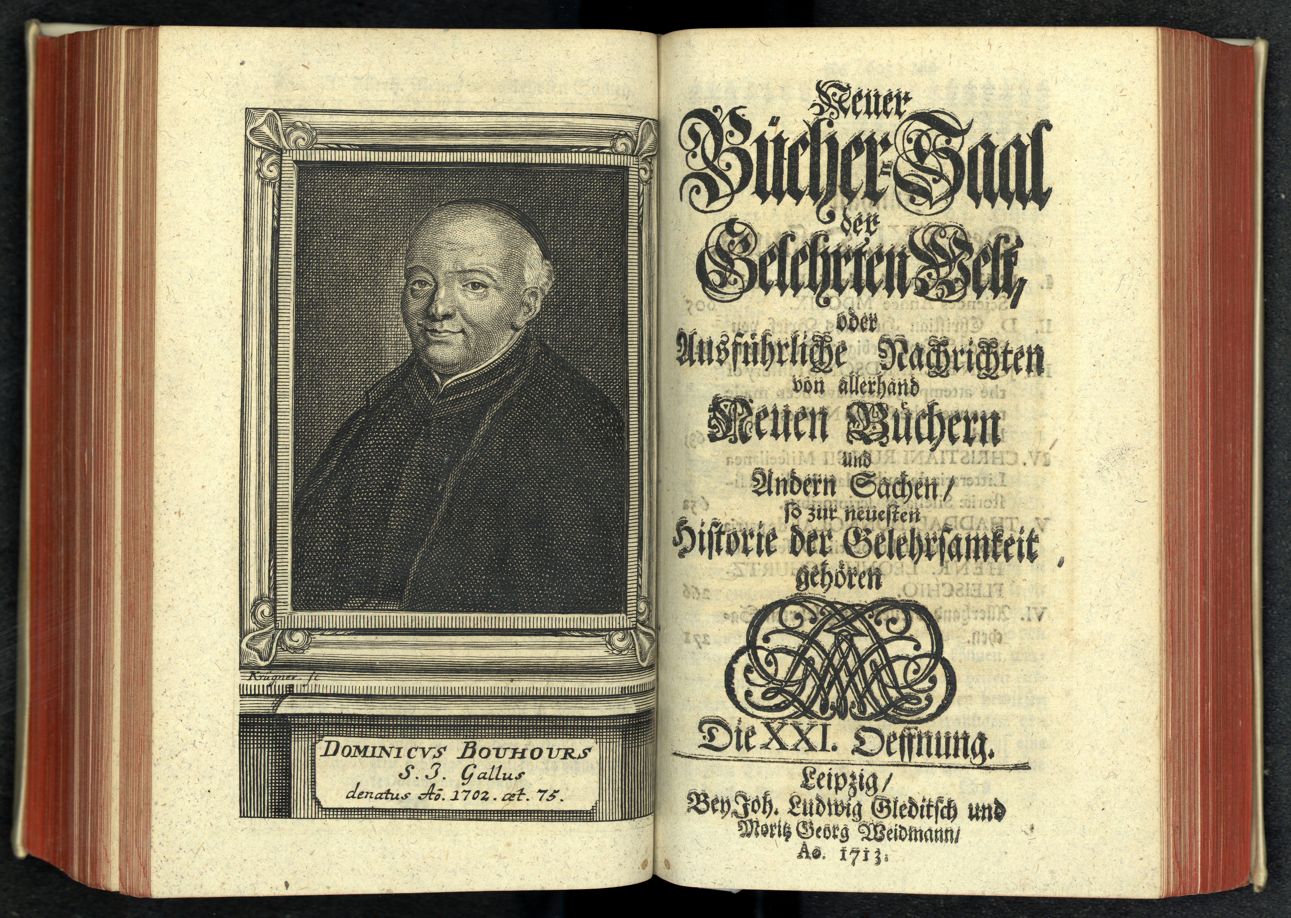 Porträt von Bouhours, Dominique  (Neuer Bücher-Saal der gelehrten Welt., 1713, 21. Oeffn., ungez. Bl. vor S. 605. [Doppelseite])