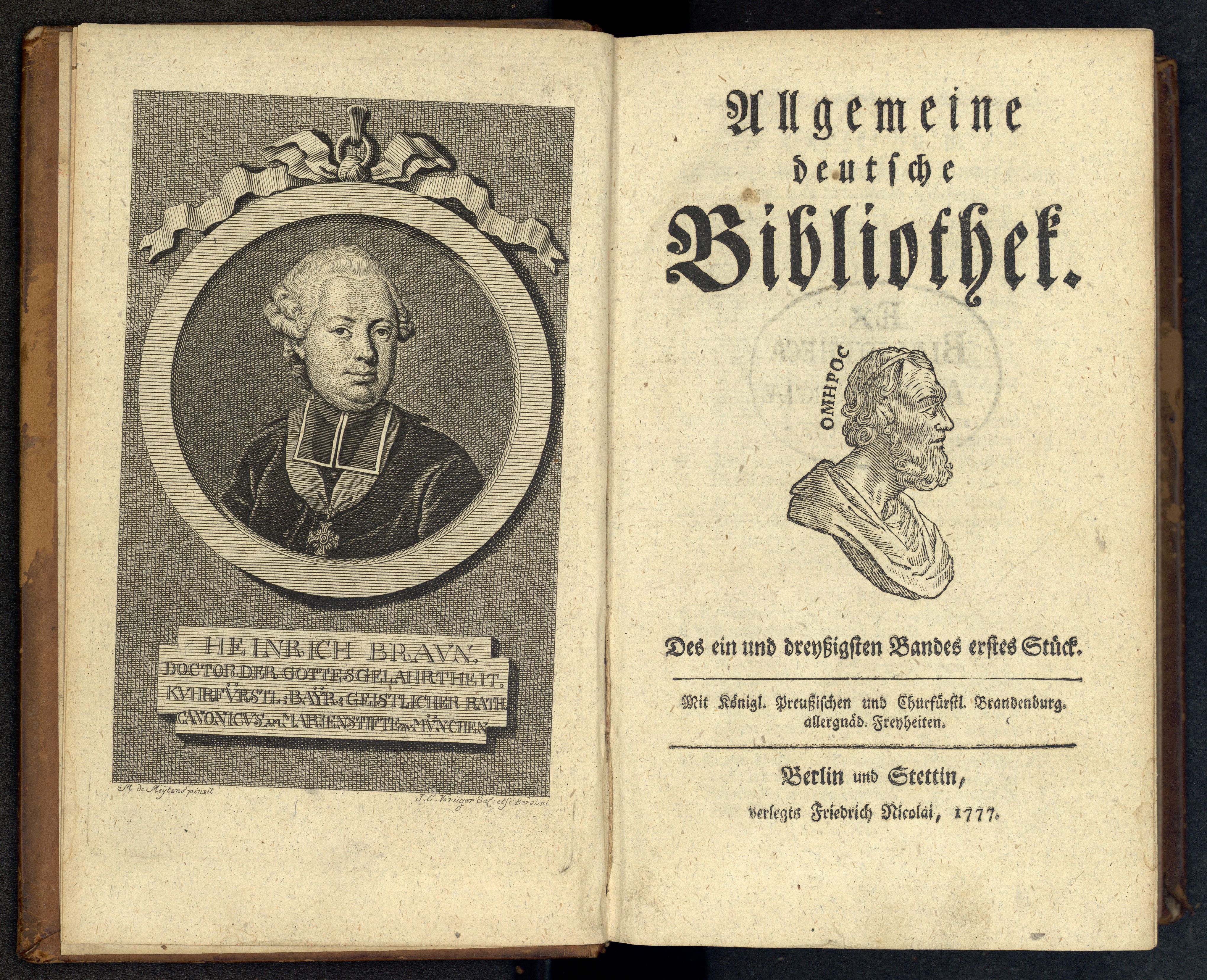 Porträt von Braun, Heinrich  (Allgemeine deutsche Bibliothek., 1777, 31. Bd., 1. St., ungez. Bl. am Anf. d. Bandes. [Doppelseite])