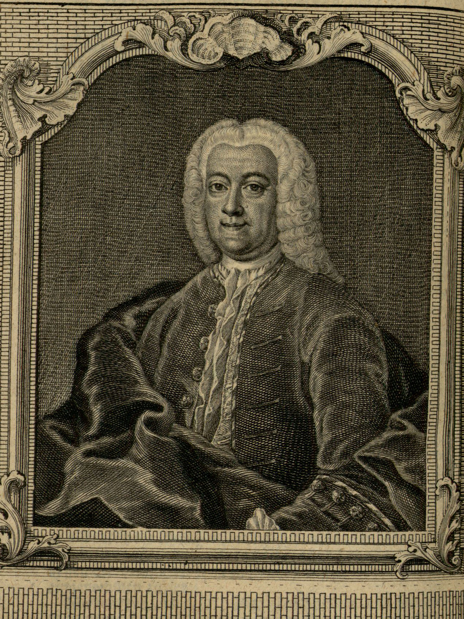 Porträt von Buder, Christian Gottlieb  (Zuverläßige Nachrichten von dem gegenwärtigen Zustande der Wissenschaften., 1753, 166. T., ungez. Bl. vor S. 708. [Zuschnitt auf Schmuckrahmen])
