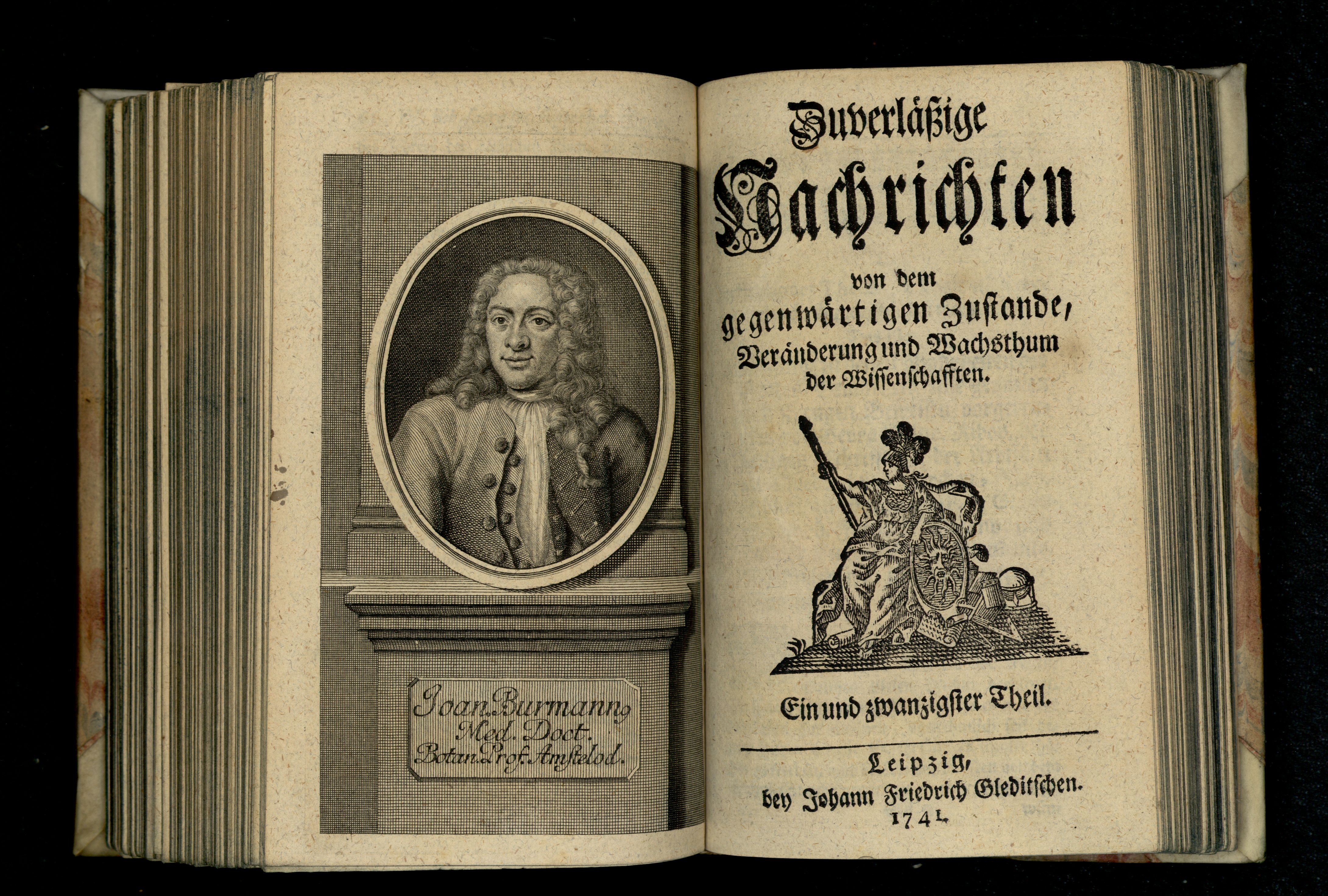 Porträt von Burman, Johannes  (Zuverläßige Nachrichten von dem gegenwärtigen Zustande der Wissenschaften., 1741, 21. T., ungez. Bl. vor S. 611. [Doppelseite])