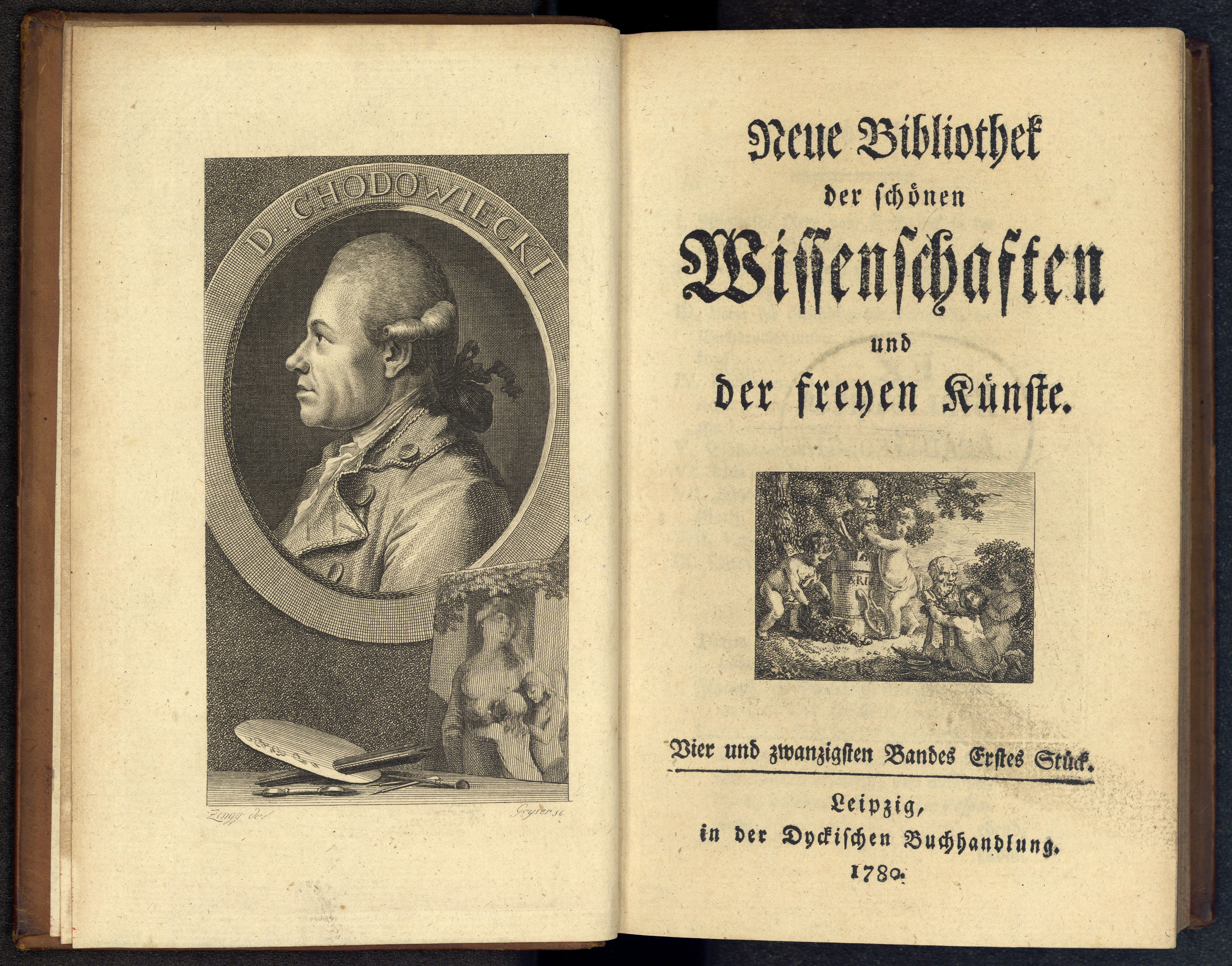 Porträt von Chodowiecki, Daniel  (Neue Bibliothek der schönen Wissenschaften., 1780, 24. Bd., 1. St., ungez. Bl. am Anf. d. Bandes. [Doppelseite])