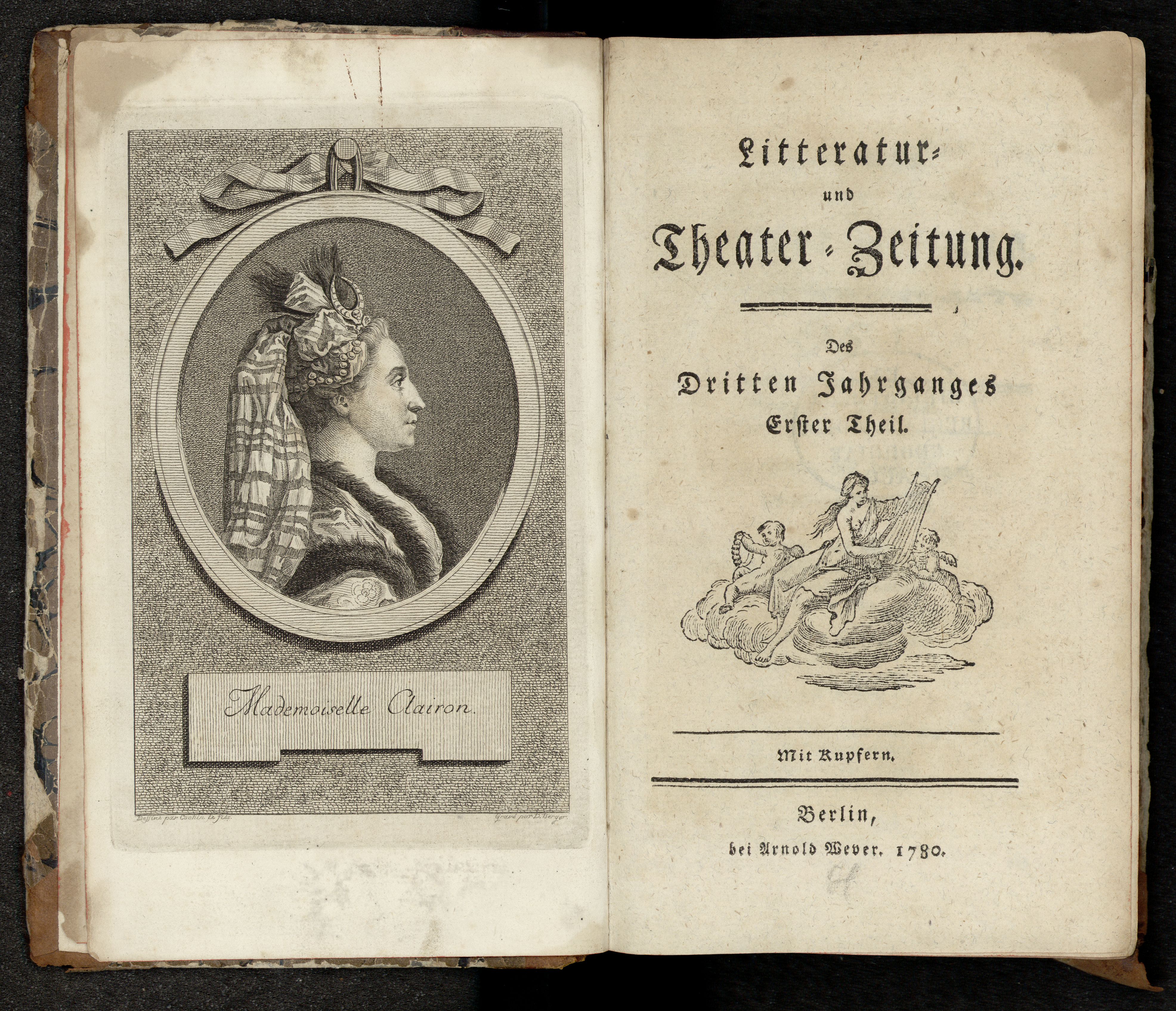 Porträt von Clairon, Claire Josèphe Hippolyte Leris de LaTude  (Litteratur- u. Theater-Zeitung., 1780, 1. T., ungez. Bl. am Anf. d. 1. Teils. [Doppelseite])