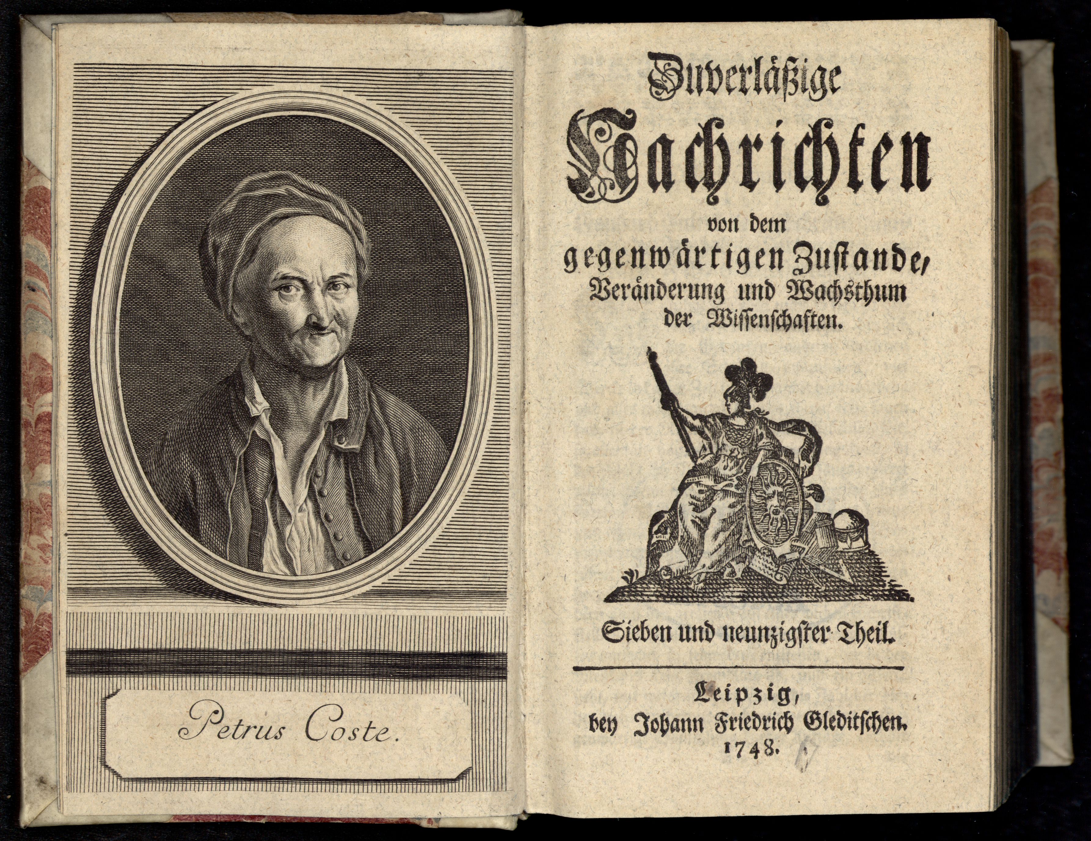 Porträt von Coste, Pierre  (Zuverläßige Nachrichten von dem gegenwärtigen Zustande der Wissenschaften., 1748, 97. T., ungez. Bl. am Anf. d. Bandes. [Doppelseite])