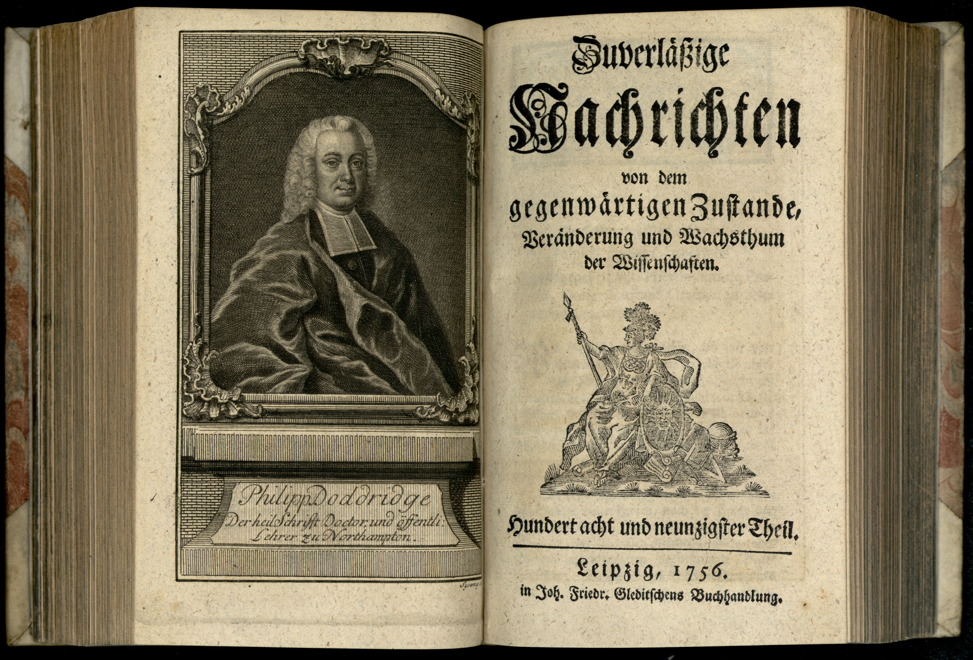Porträt von Doddridge, Philip  (Zuverläßige Nachrichten von dem gegenwärtigen Zustande der Wissenschaften., 1756, 198. T., ungez. Bl. vor S. 394. [Doppelseite])
