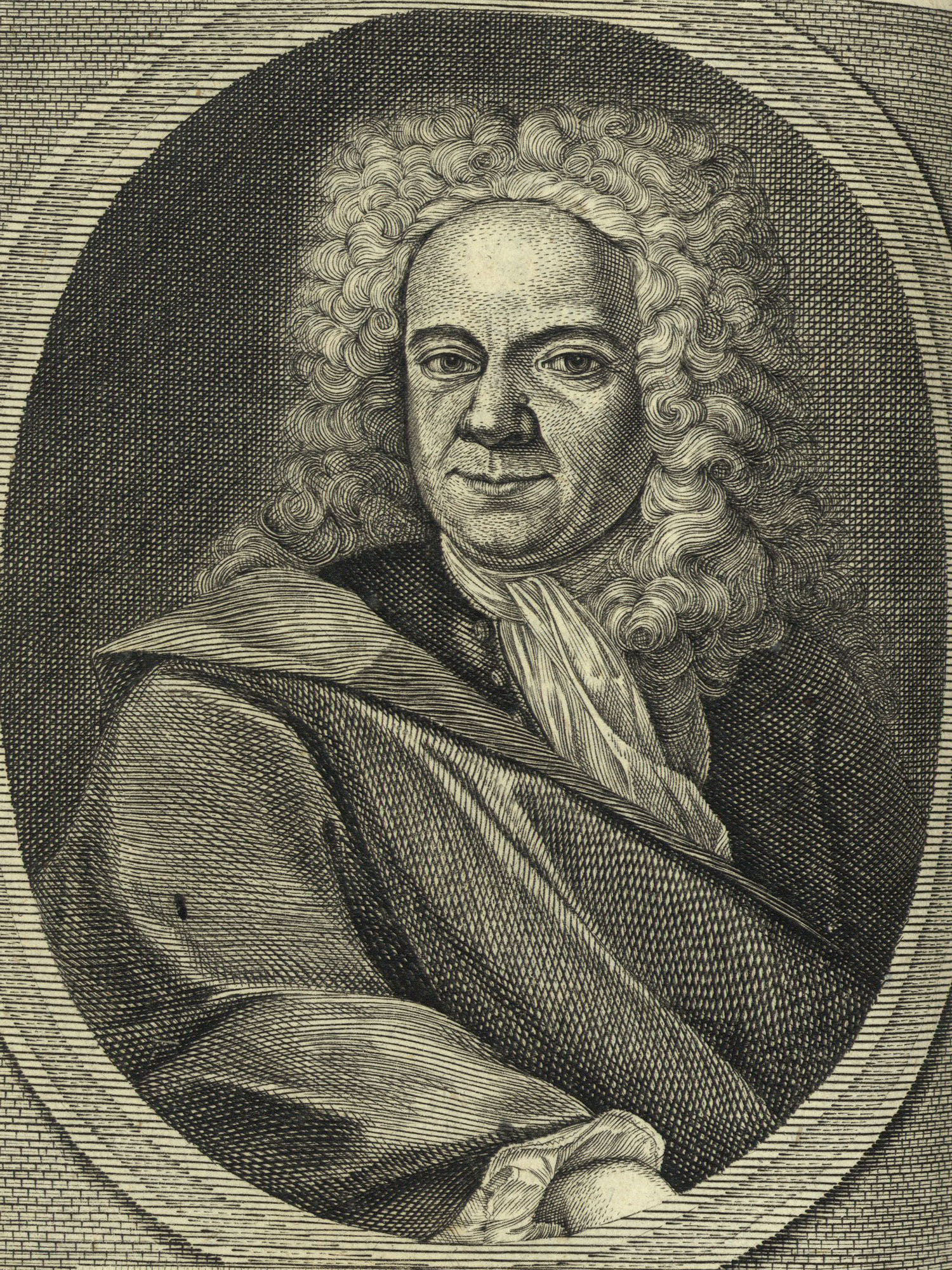 Porträt von Doppelmayr, Johann Gabriel  (Fränckische Acta Erudita et Curiosa., 1727, 6. Slg., ungez. Bl. vor S. 381. [Zuschnitt auf Schmuckrahmen])