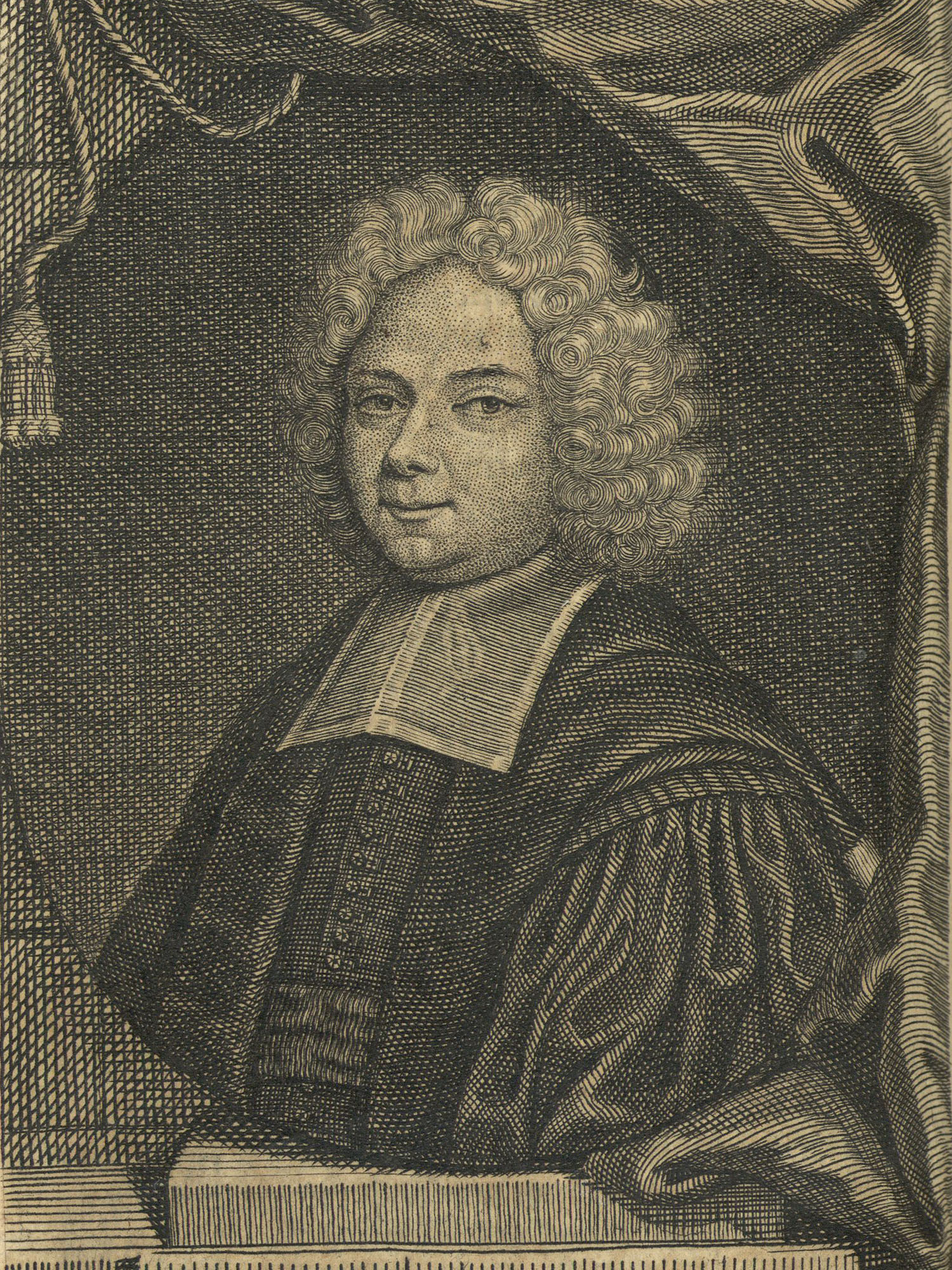 Porträt von Du Pin, Louis Ellies  (Neuer Bücher-Saal der gelehrten Welt., 1710, 5. Oeffn., ungez. Bl. vor S. 249. [Zuschnitt auf Schmuckrahmen])