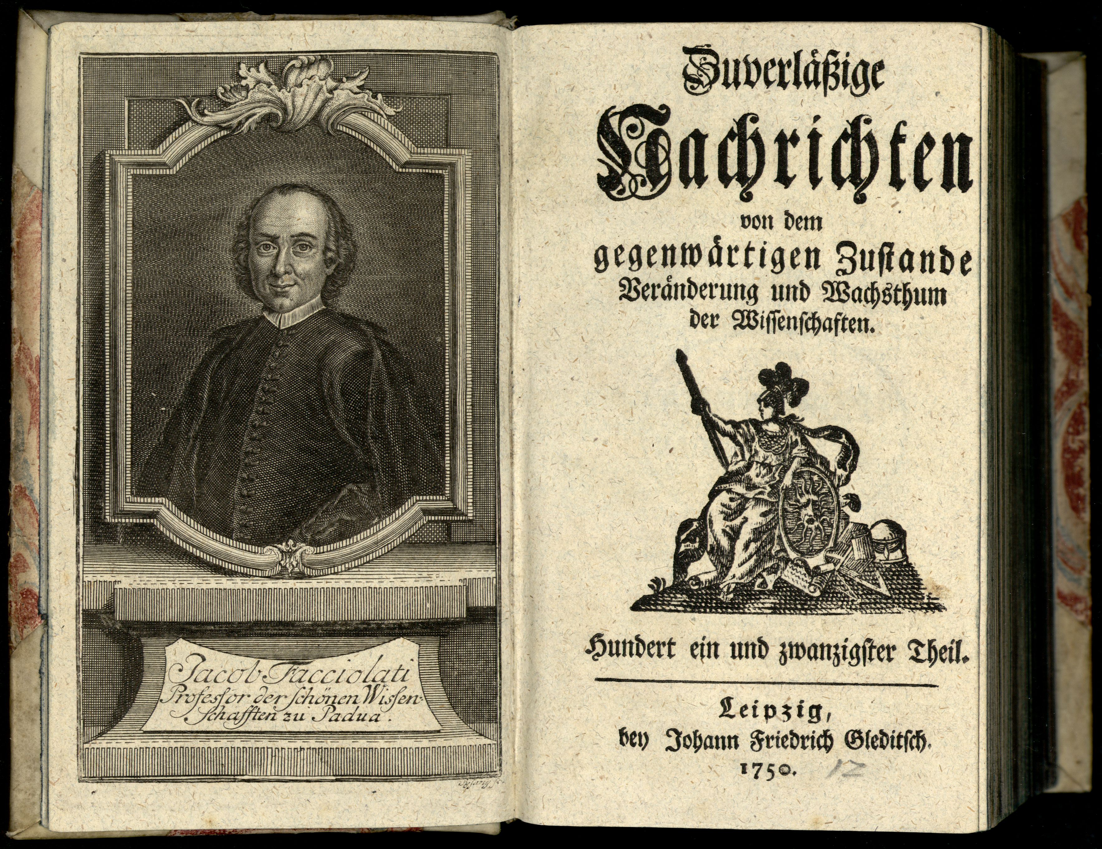 Porträt von Facciolati, Jacopo  (Zuverläßige Nachrichten von dem gegenwärtigen Zustande der Wissenschaften., 1750, 121. T., ungez. Bl. am Anf. d. Bandes. [Doppelseite])