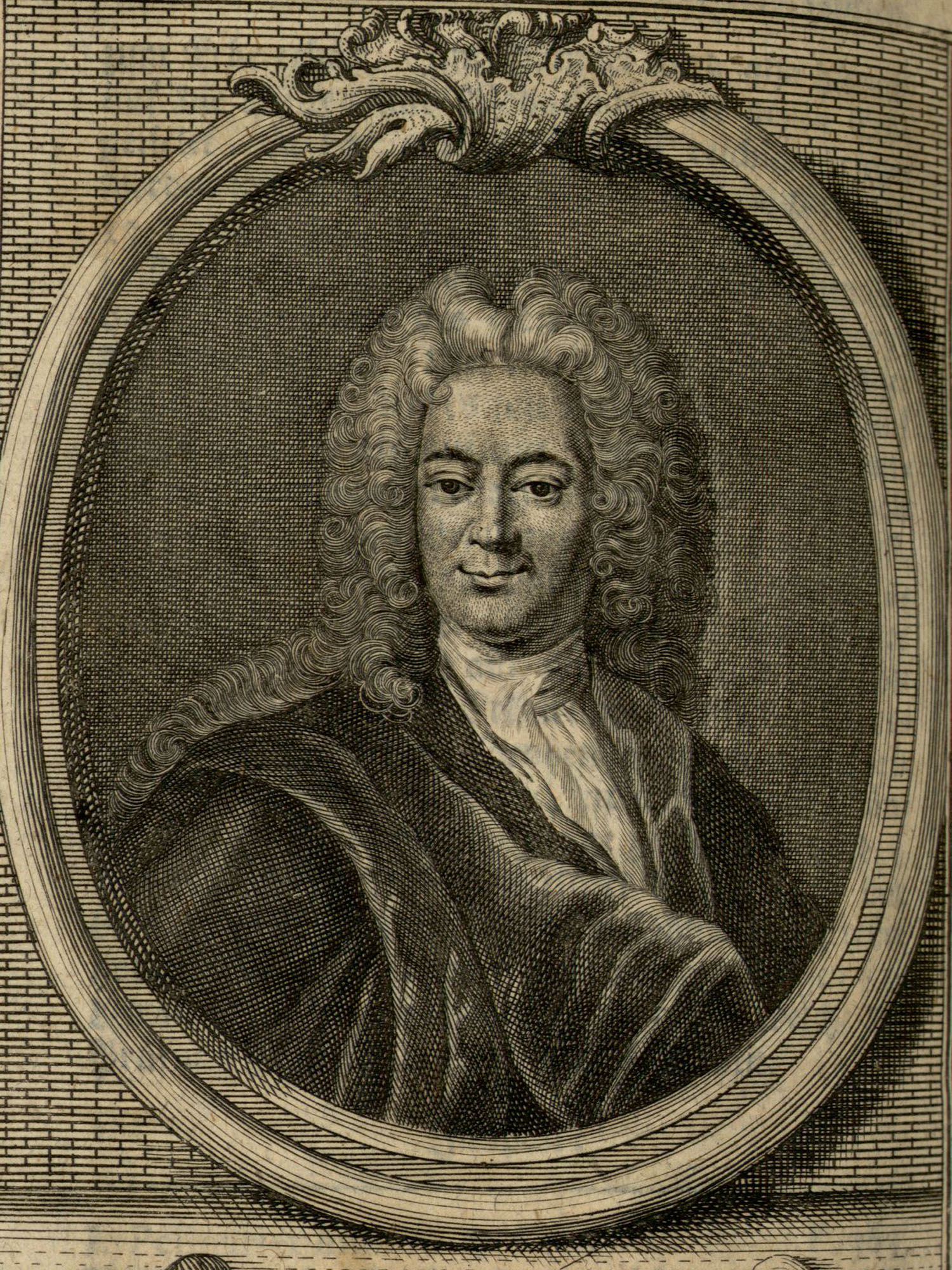 Porträt von Gherardi, Evaristo  (Zuverläßige Nachrichten von dem gegenwärtigen Zustande der Wissenschaften., 1751, 140. T., ungez. Bl. vor S. 442. [Zuschnitt auf Schmuckrahmen])