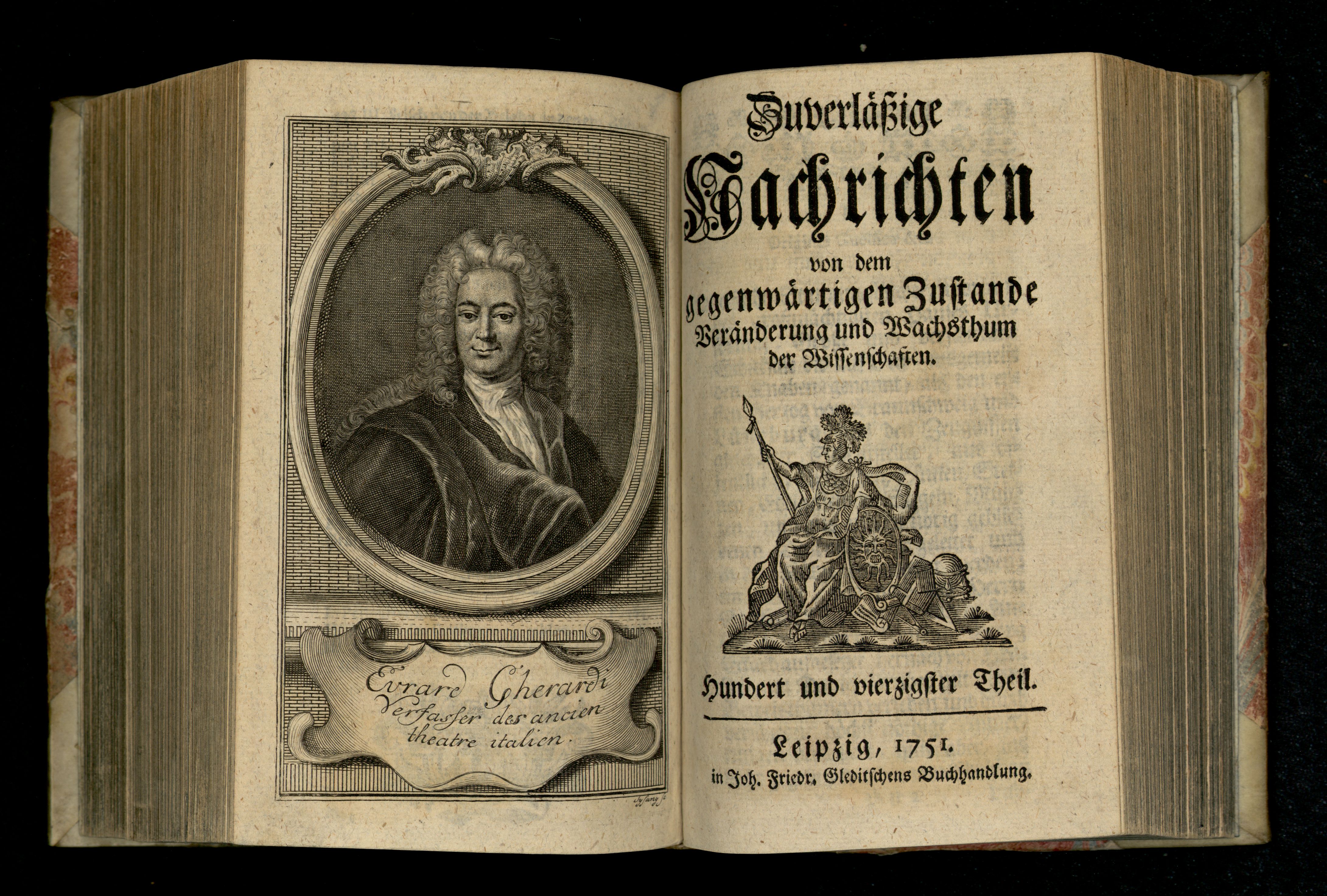 Porträt von Gherardi, Evaristo  (Zuverläßige Nachrichten von dem gegenwärtigen Zustande der Wissenschaften., 1751, 140. T., ungez. Bl. vor S. 442. [Doppelseite])