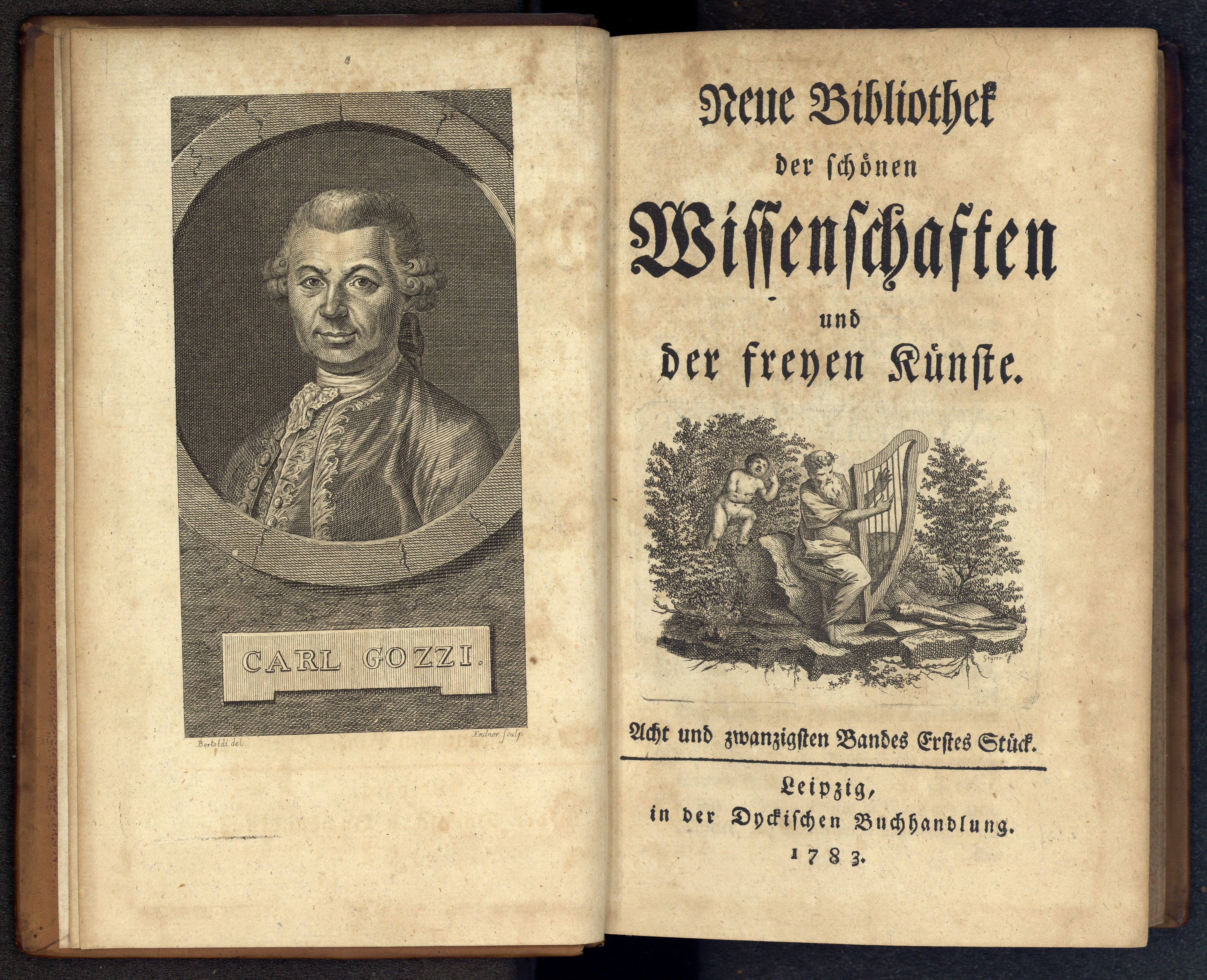 Porträt von Gozzi, Carlo  (Neue Bibliothek der schönen Wissenschaften., 1783, 28. Bd., 1. St., ungez. Bl. am Anf. d. Bandes. [Doppelseite])
