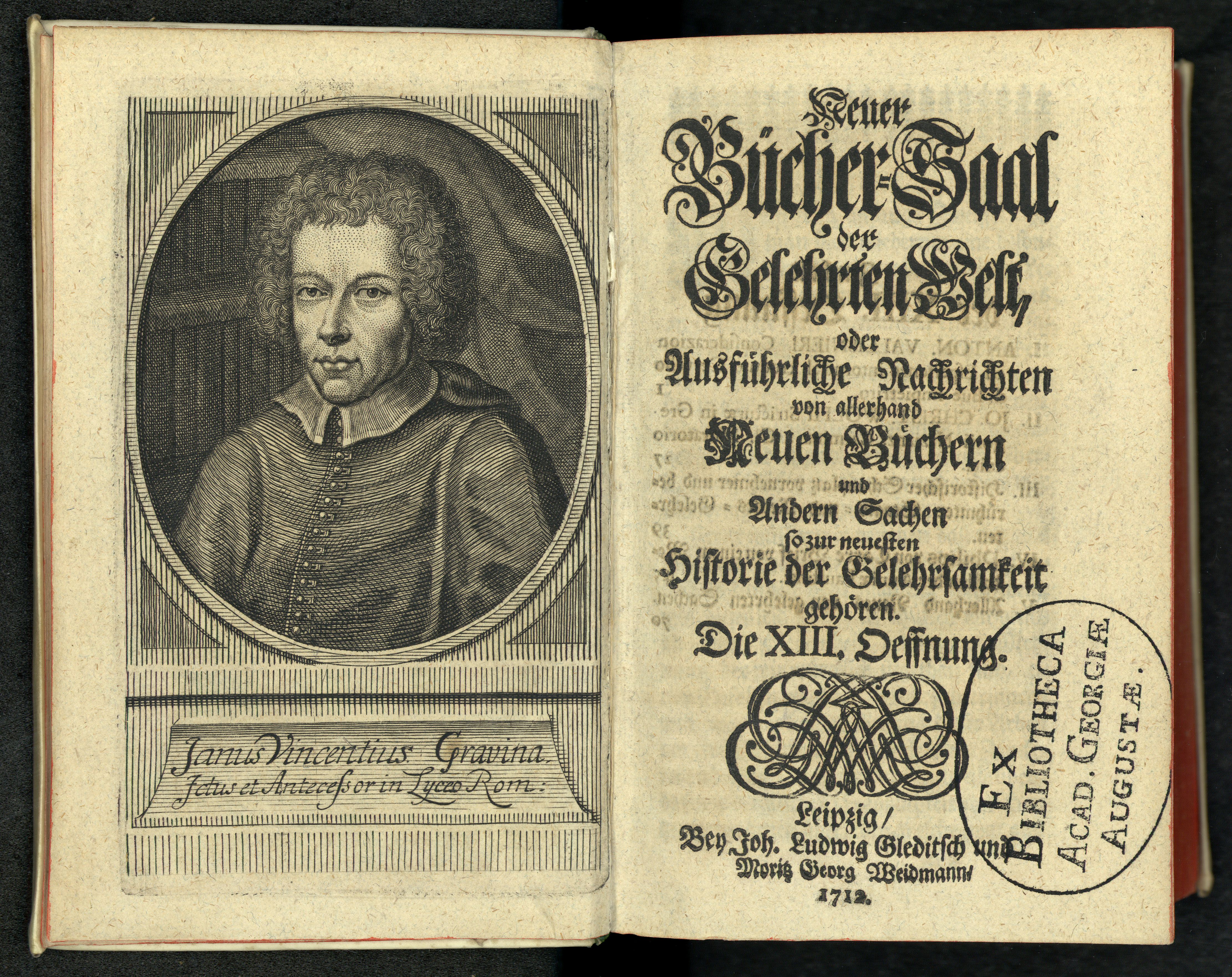 Porträt von Gravina, Gianvincenzo  (Neuer Bücher-Saal der gelehrten Welt., 1712, 13. Oeffn., ungez. Bl. am Anf. d. Bandes. [Doppelseite])