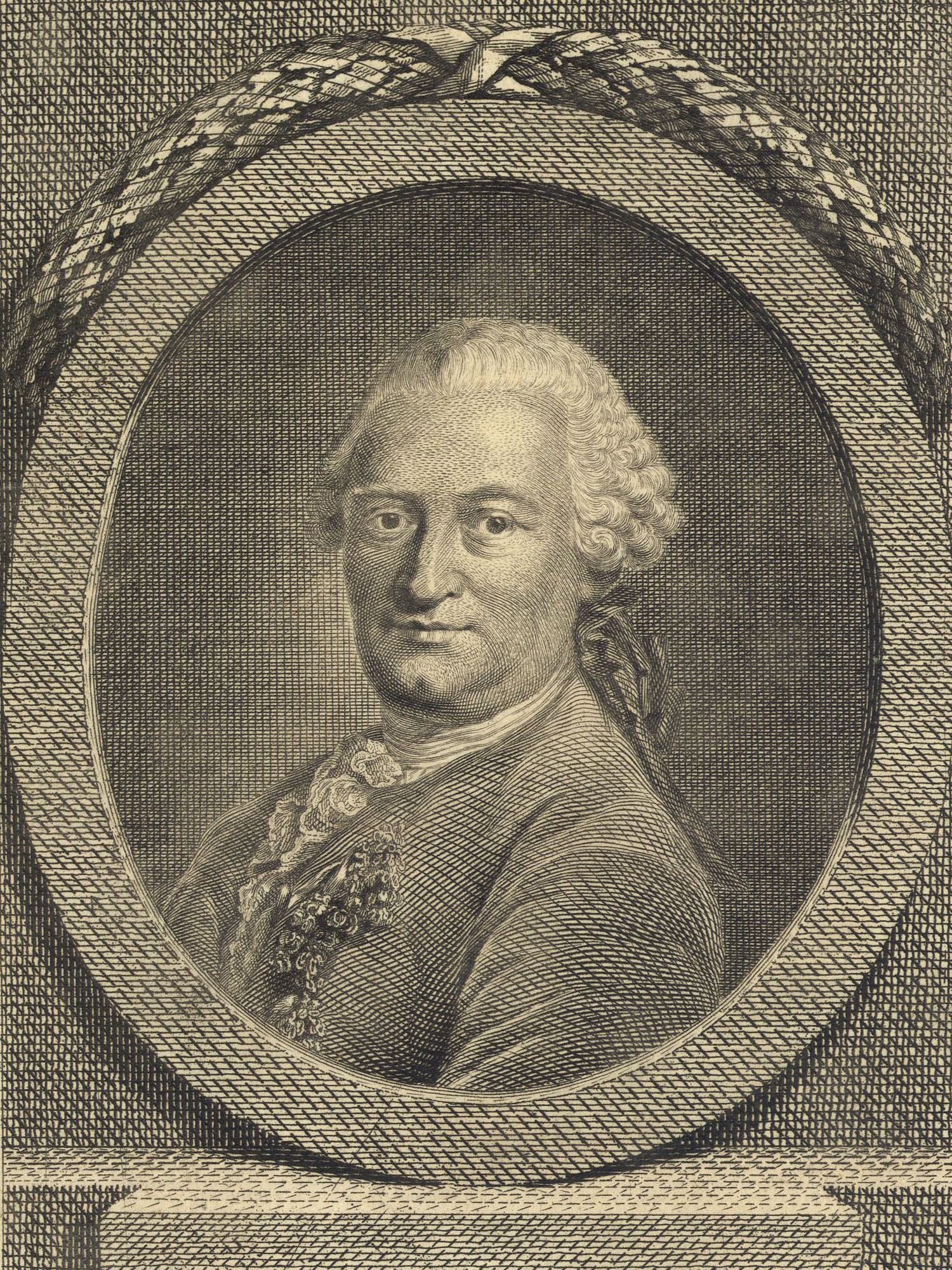 Porträt von Heinecken, Karl Heinrich von  (Neue Bibliothek der schönen Wissenschaften., 1781, 26. Bd., 1. St., ungez. Bl. am Anf. d. Bandes. [Zuschnitt auf Schmuckrahmen])