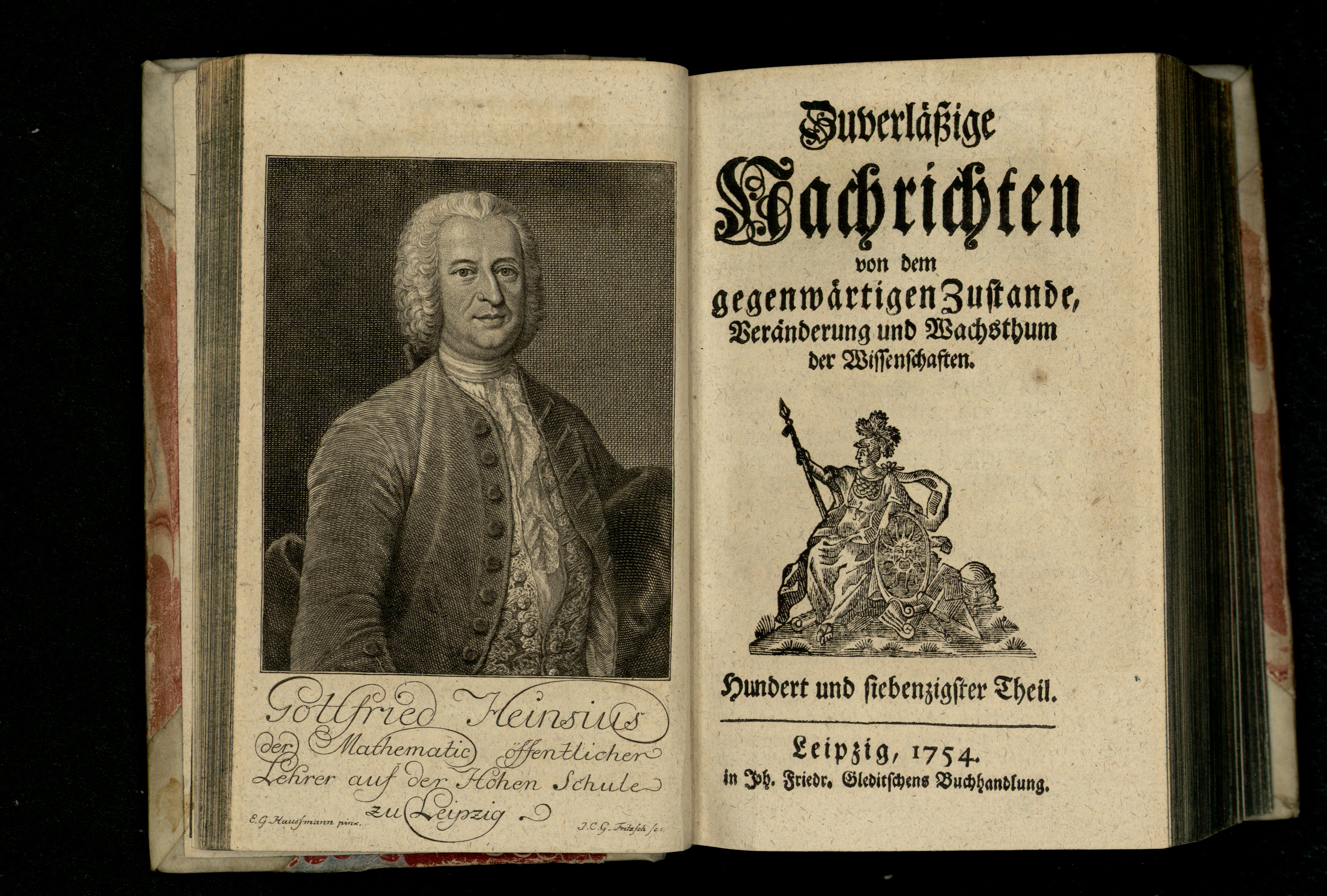 Porträt von Heinsius, Gottfried  (Zuverläßige Nachrichten von dem gegenwärtigen Zustande der Wissenschaften., 1754, 170. T., ungez. Bl. vor S. 82. [Doppelseite])