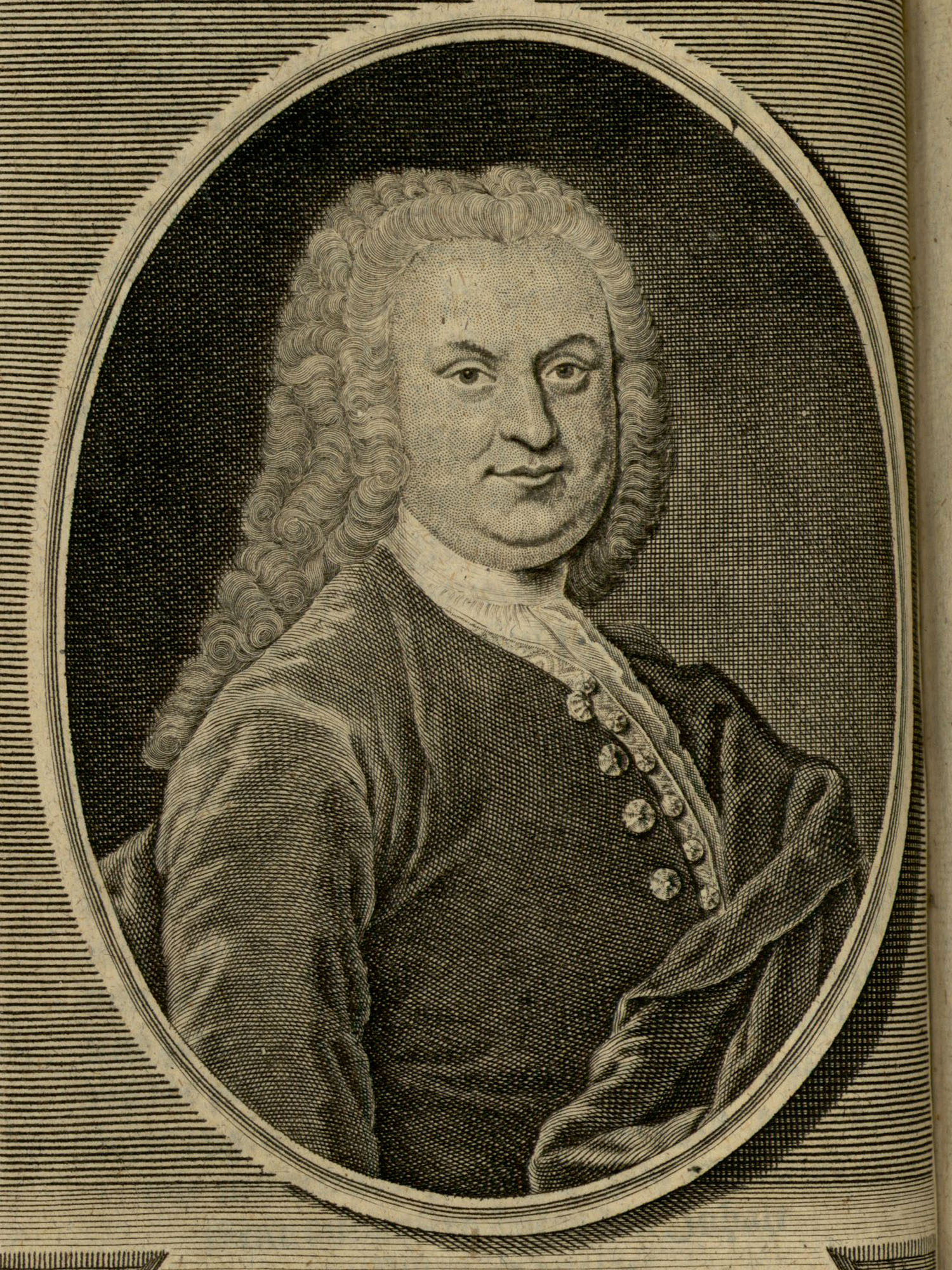 Porträt von Hommel, Ferdinand August  (Zuverläßige Nachrichten von dem gegenwärtigen Zustande der Wissenschaften., 1743, 40. T., ungez. Bl. vor S. 231. [Zuschnitt auf Schmuckrahmen])
